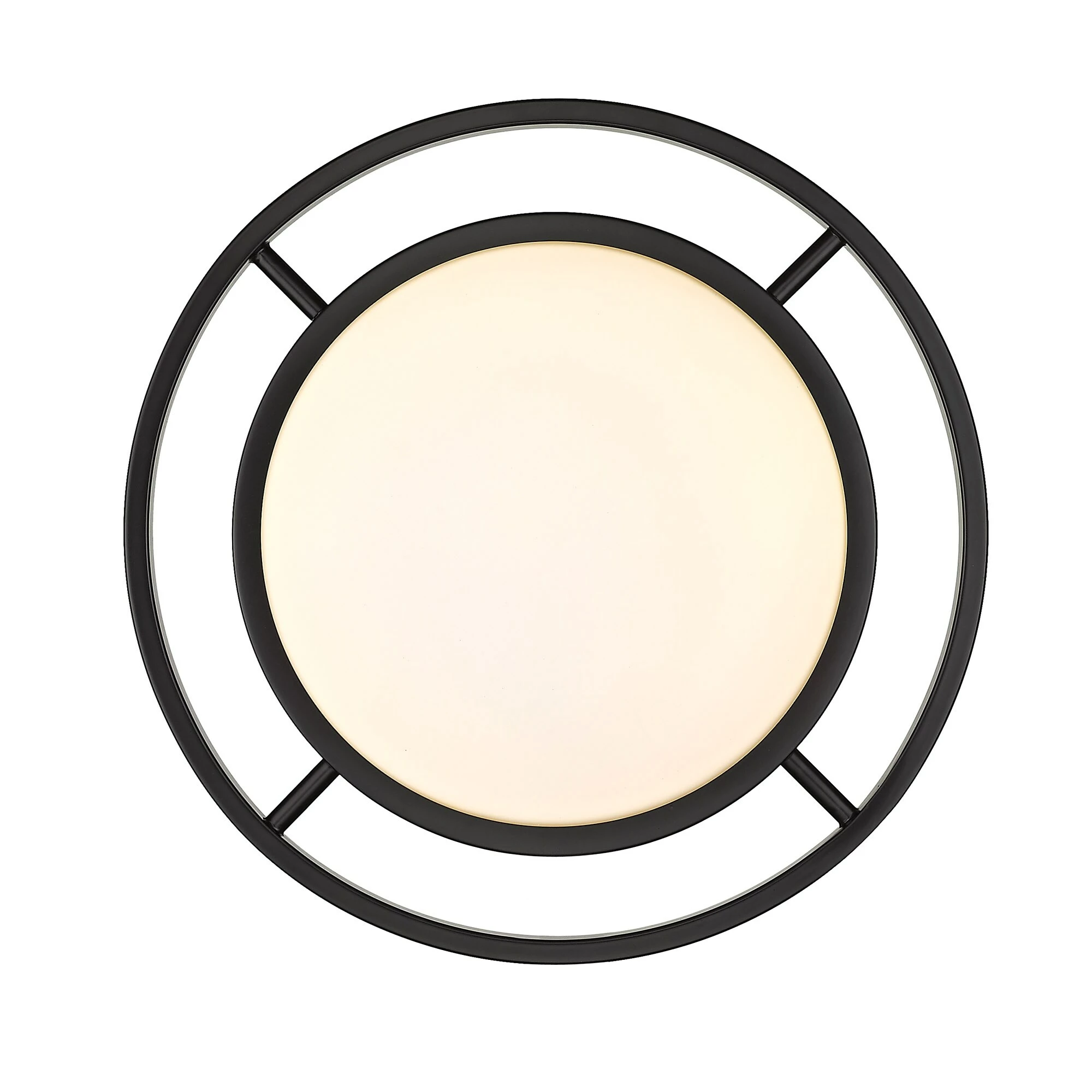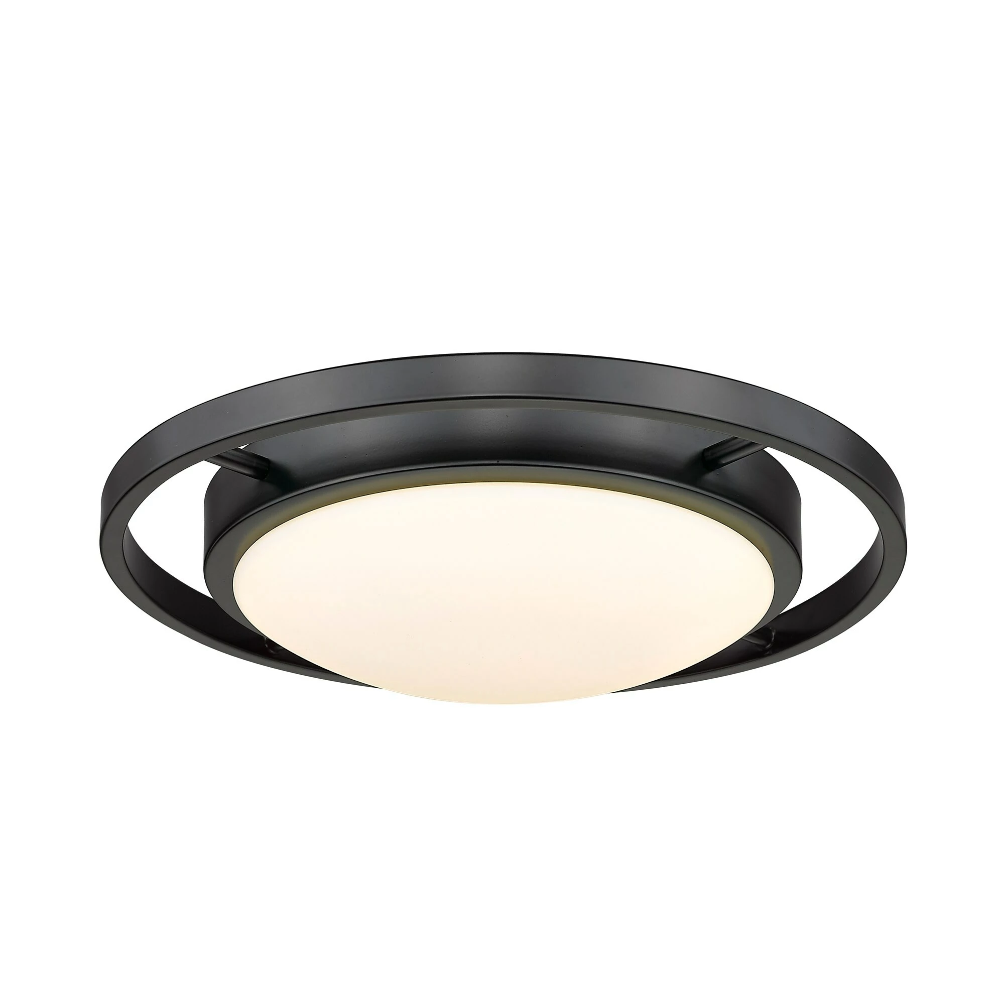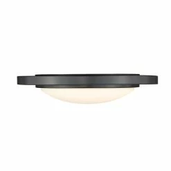 With LED lamping and a clean silhouette, Astra offers a blend of Modern and Transitional styles. The matte black finish contrasts the bright, white opal glass. When lit, the unique halo pattern adds a geometric aspect to the look. The fixtures are available in multiple sizes. This flush mount provides wide-spread ambient lighting and is perfect for contemporary homes.