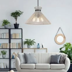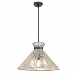 The Avon collection is simple sophistication in a natural form. The collection features twisted organic fibers stretched over sturdy steel frames. Tight in spots and wide in others, bleached Raphia rope is braided and stretched on matte black frames. To add visual interest, our designers used textured metal bands as accents. Avon’s feminine silhouettes and neutral hues are perfect for transitional to contemporary homes. This collection has multiple fixture types. Pendants provide stylish focal points and this 3-light pendant is comfortably sized for a small nook, dining, or entry.