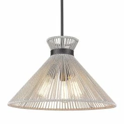 The Avon collection is simple sophistication in a natural form. The collection features twisted organic fibers stretched over sturdy steel frames. Tight in spots and wide in others, bleached Raphia rope is braided and stretched on matte black frames. To add visual interest, our designers used textured metal bands as accents. Avon’s feminine silhouettes and neutral hues are perfect for transitional to contemporary homes. This collection has multiple fixture types. Pendants provide stylish focal points and this 3-light pendant is comfortably sized for a small nook, dining, or entry.