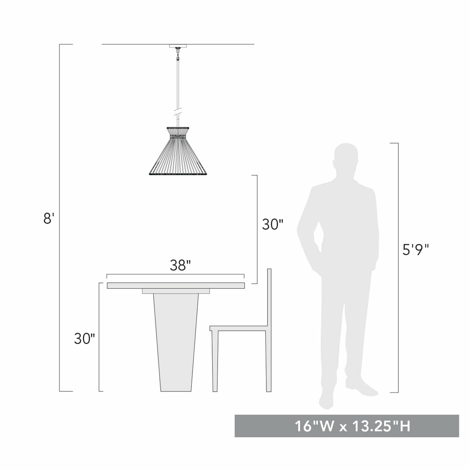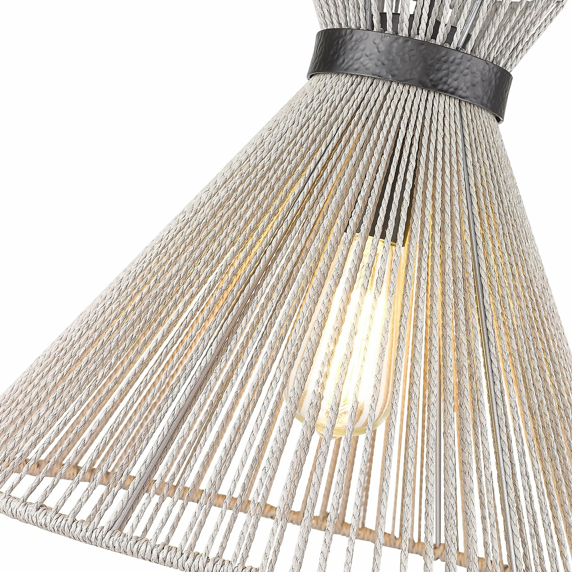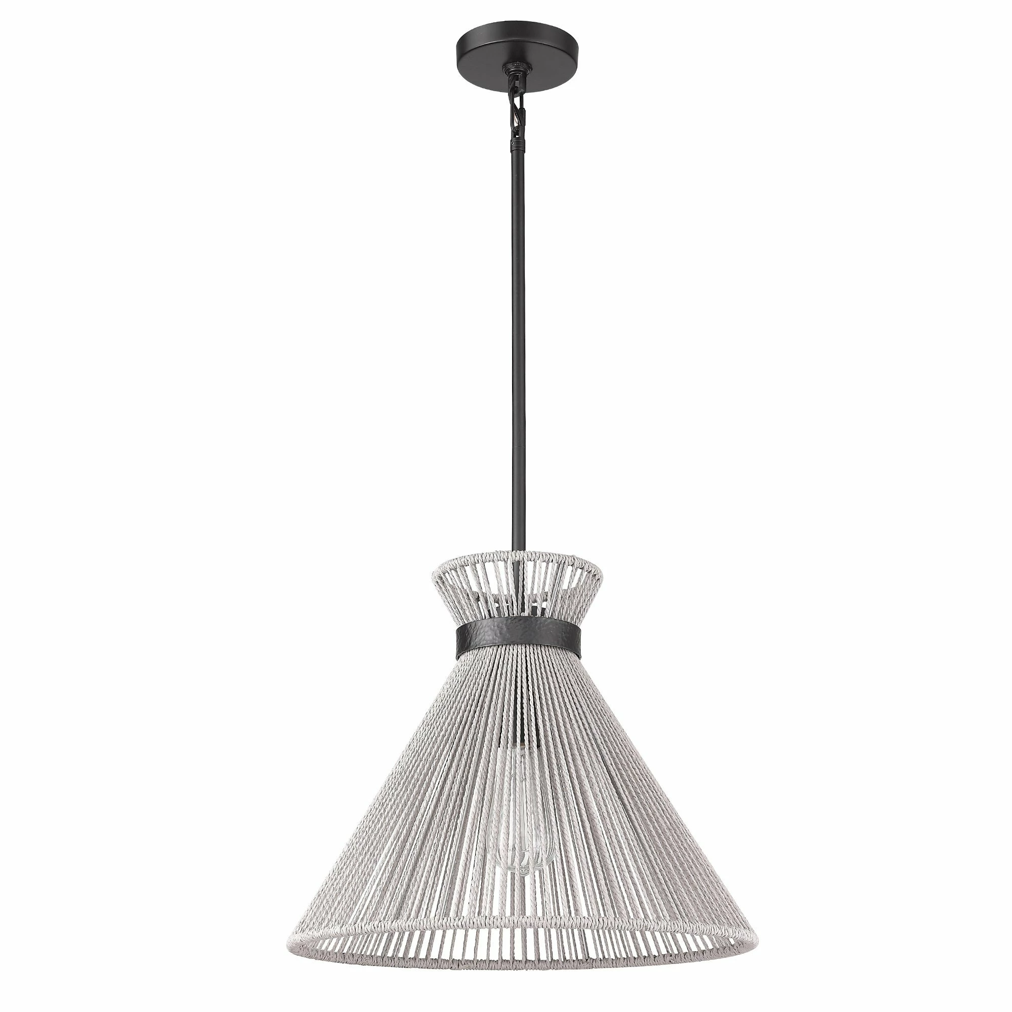 The Avon collection is simple sophistication in a natural form. The collection features twisted organic fibers stretched over sturdy steel frames. Tight in spots and wide in others, bleached Raphia rope is braided and stretched on matte black frames. To add visual interest, our designers used textured metal bands as accents. Avon’s feminine silhouettes and neutral hues are perfect for transitional to contemporary homes. This collection has multiple fixture types. This medium pendant, with its unique look, will draw attention and provide bright light when grouped over a kitchen island or hung individually over a breakfast table.