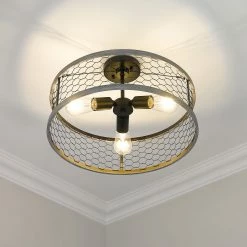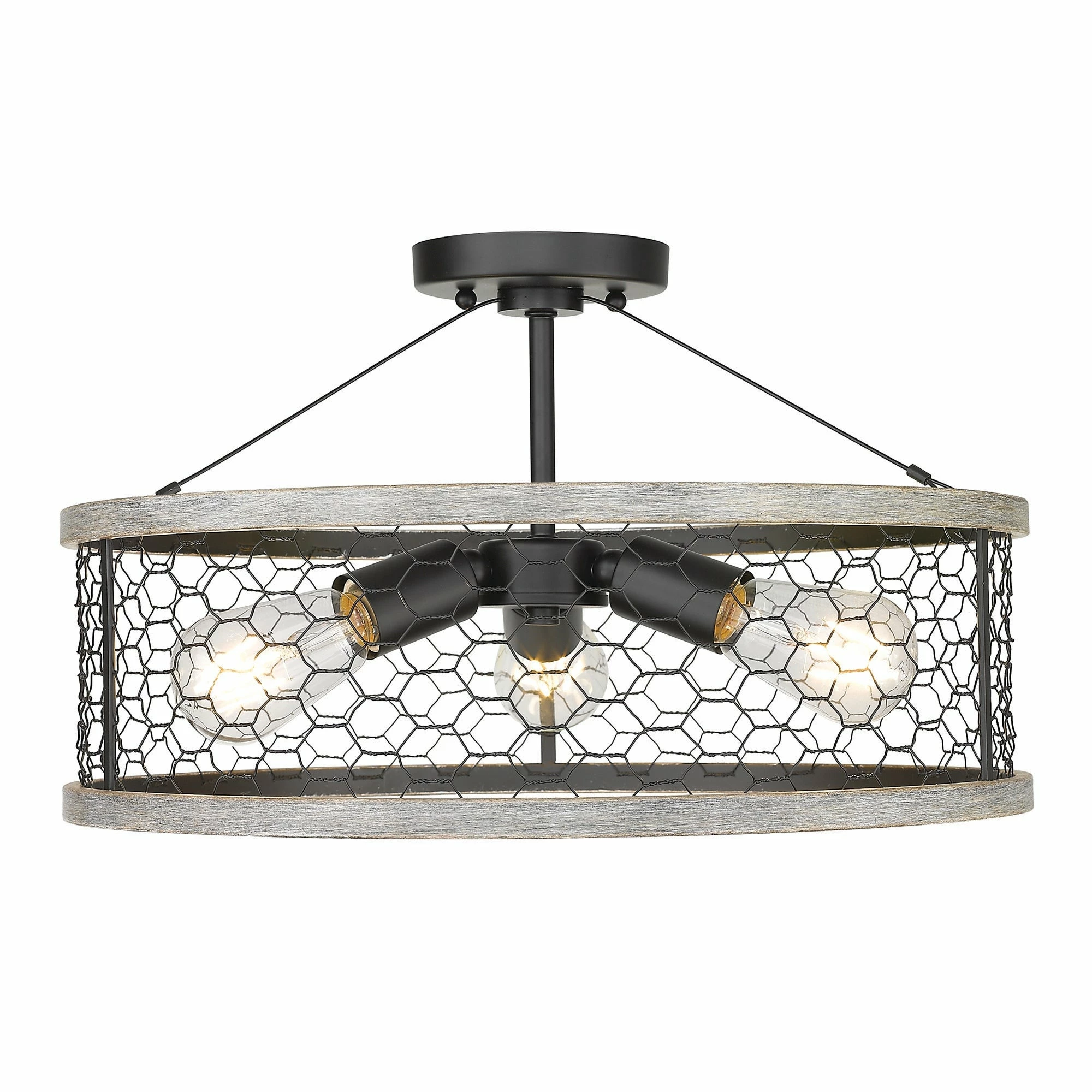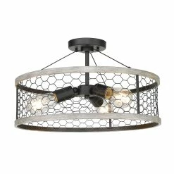 The Bailey collection brings casual, rustic styling to any space. On-trend with modern country interior design, this fixture is perfect for homes with farmhouse dΓ©cor. The open bottom shade features rustic chicken wire held together by a hand-painted faux wood frame. The faux wood frame contains hints of gray and brown hues. Add a bit of country-chic style to any bathroom, kitchen, living room, entry, or hallway.