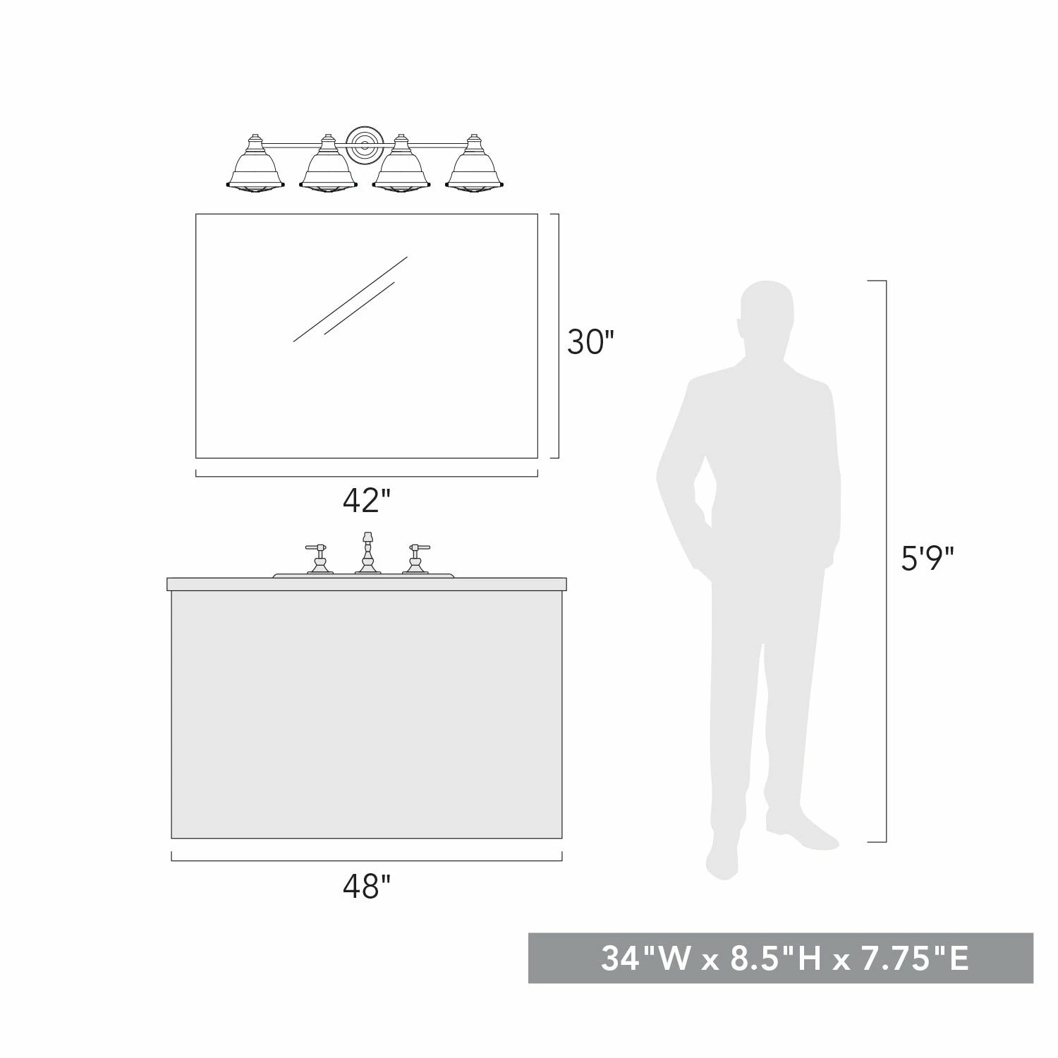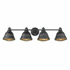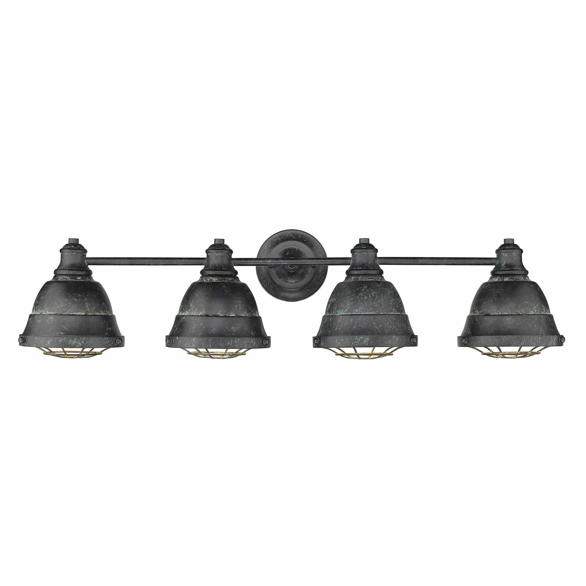 The Bartlett collection features industrial, vintage-inspired fixtures with simple, traditional silhouettes that are a nod to a bygone era. The series features authentic details like caged diffusers and exposed hardware. The Black Patina finish is lightly weathered. This 4-light bath vanity is damp rated.
