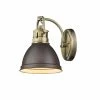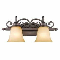 Warm the ambiance in your guest or powder room with this two-light vanity fixture featuring a richย rubbed bronze finish. Inverted, bell-shaped tea stone shades cast light downward, providing light where it’s most needed.