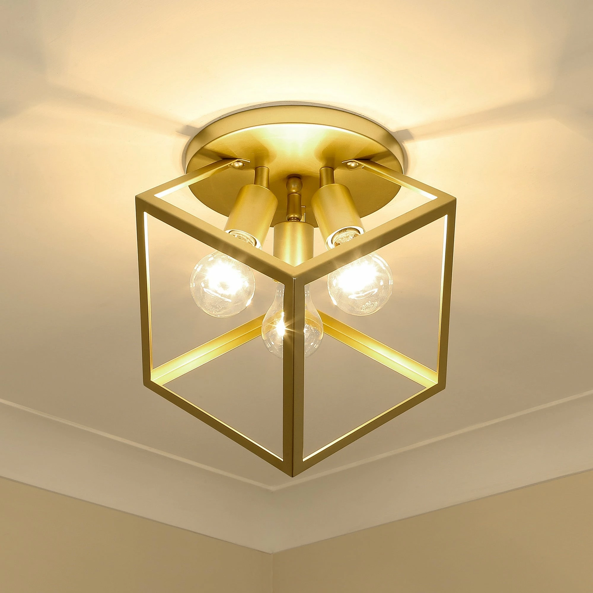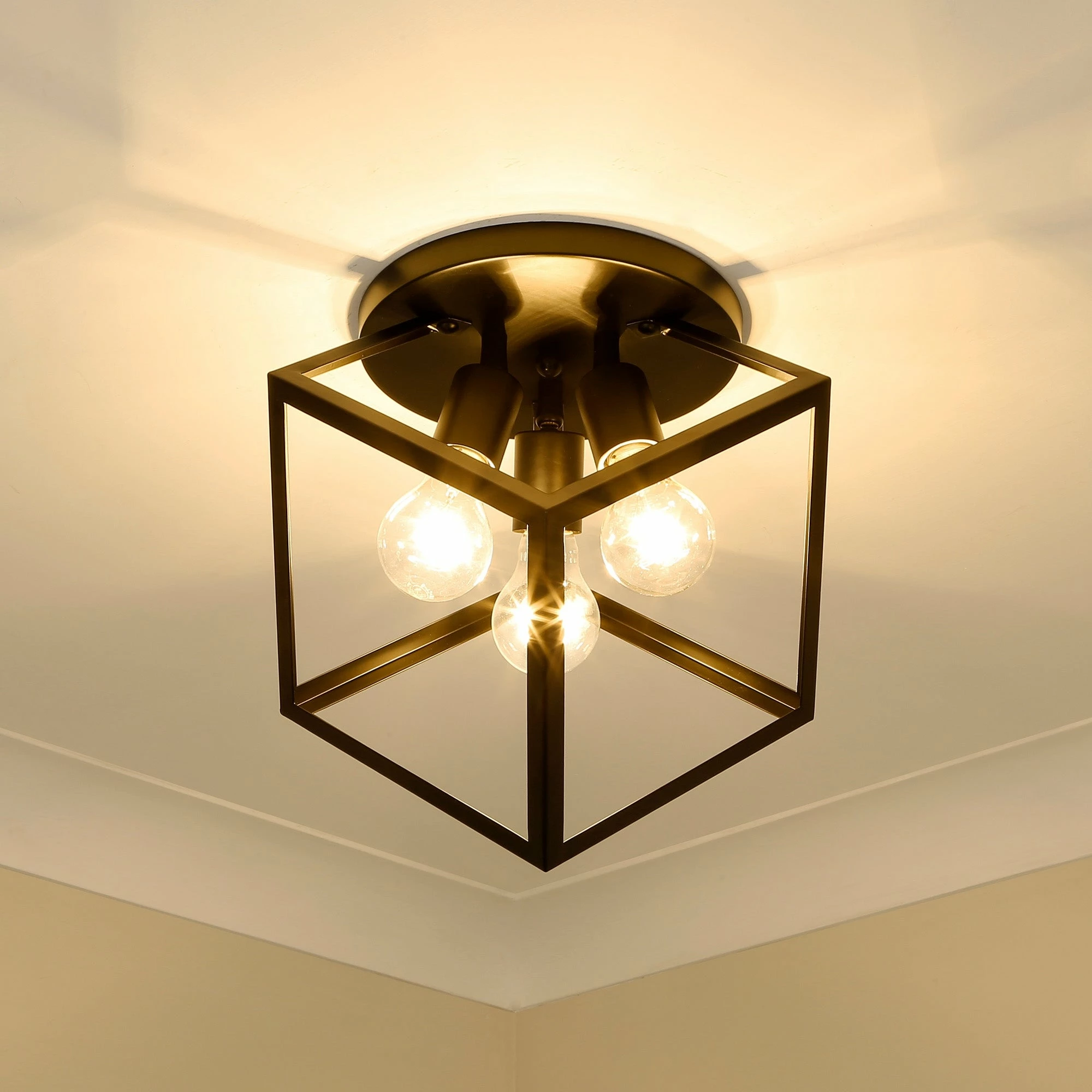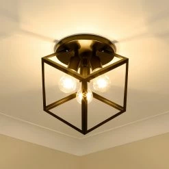Strong, industrial lines and a unique geometric design are the basis of the Cassio series. Dramatic, double edges and bold lines make Cassio a focal point that is sure to add visual interest to any space. As if frozen in space, an exposed lamp sits within a suspended 3-dimensional cube. The open, glass-free cage lends an airy, playful tone while providing utility in the form of widespread light and easy bulb changes. Choose between trending metal finishes like Olympic Gold and Matte Black.