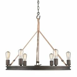 Inspired by the sea, this coastal collection features a simple design with authentic, nautical details. Tied in sailor’s knots, woven ropes loop metal cleats before being suspended from maritime hooks. The contrast between the color and texture of the rope and metalwork creates visual interest. Created to be hung with the lamps facing up or down, the transitional fixtures are versatile. This look is perfect for seaside retreats, casual lofts, and rustic bungalows. This 6-Light chandelier is comfortably sized for intimate dining and living areas.