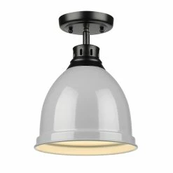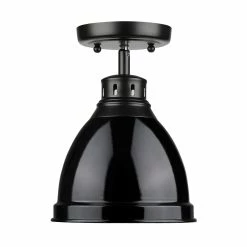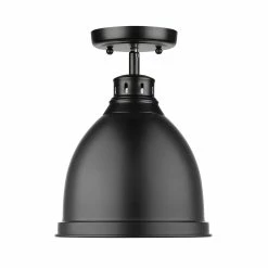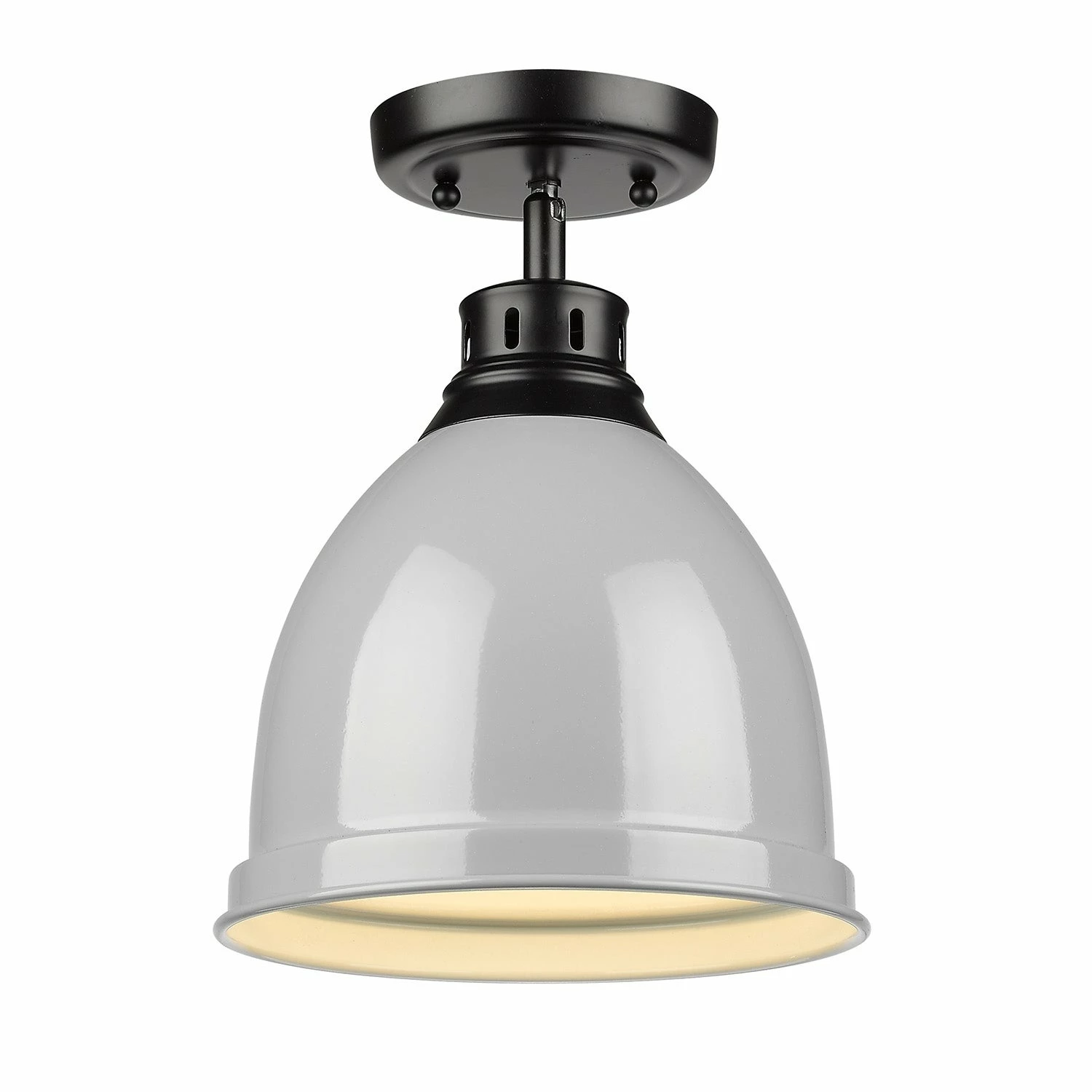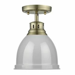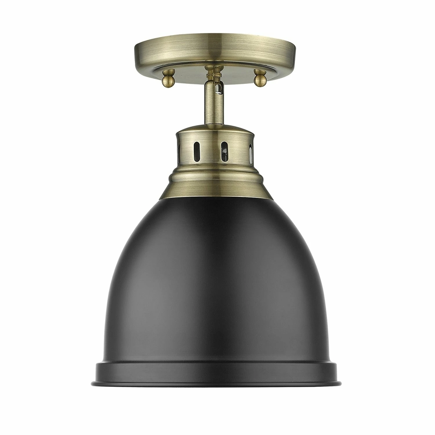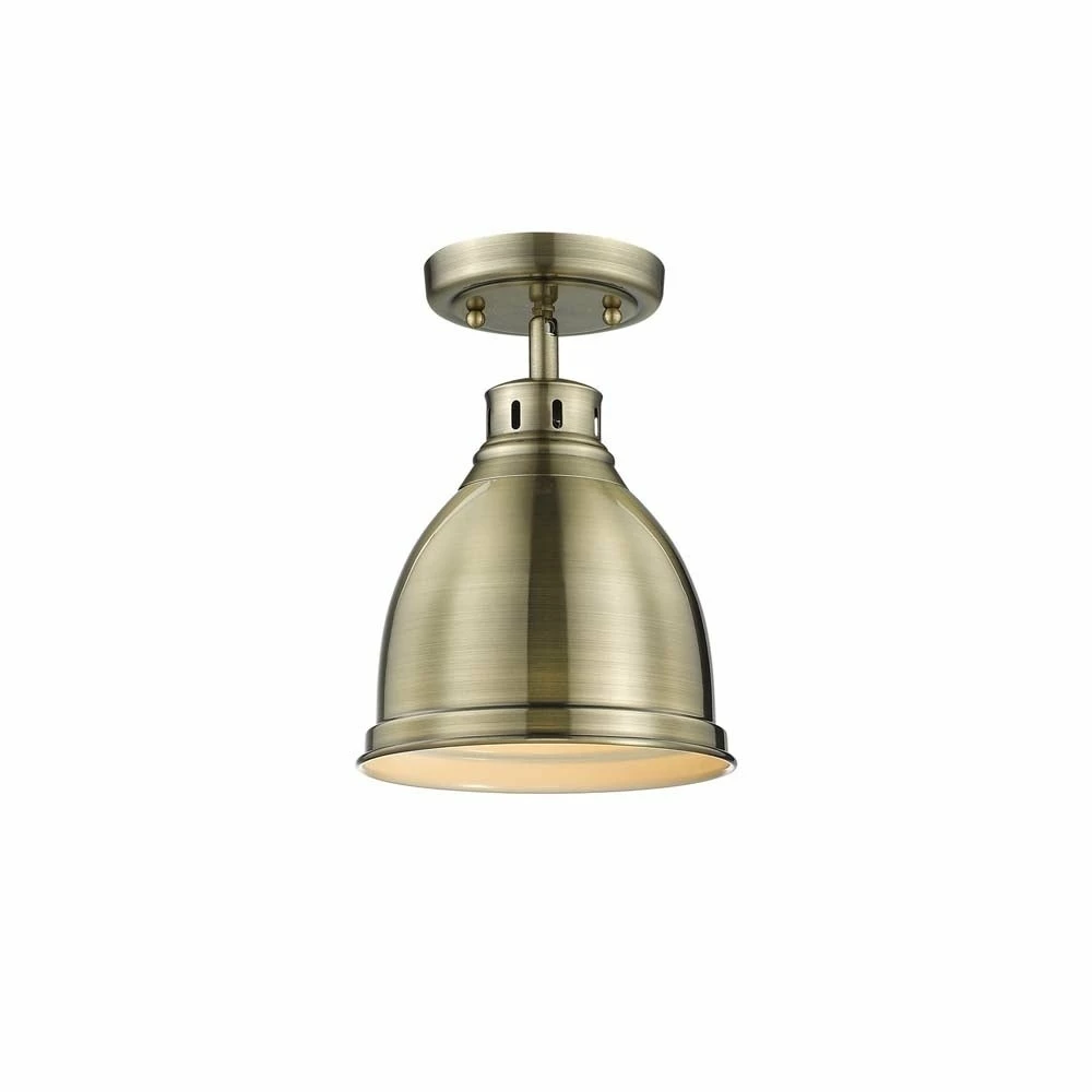 Brighten your foyer while adding transitional charm with the Duncan ceiling fixture from Golden Lighting. Featuring a charming aged-brass finish and classic bell shape, this downlight lends a touch of elegance to your home. With a flush-mount design, this light fixture works great in rooms with lower ceiling levels.