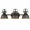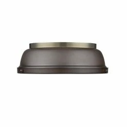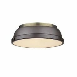 Update your room’s look with a rustic vibe using this aged brass flush-mount light fixture. The round rubbed bronze shade gives off a vintage feel that also fits well with contemporary settings.