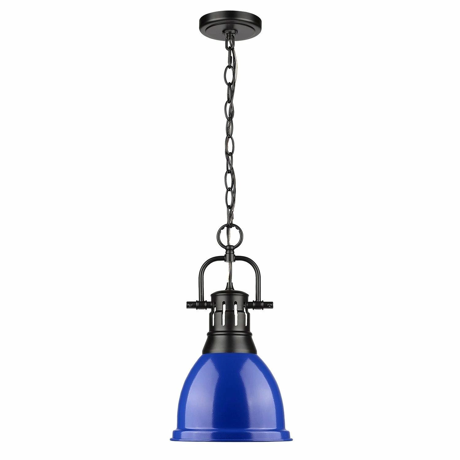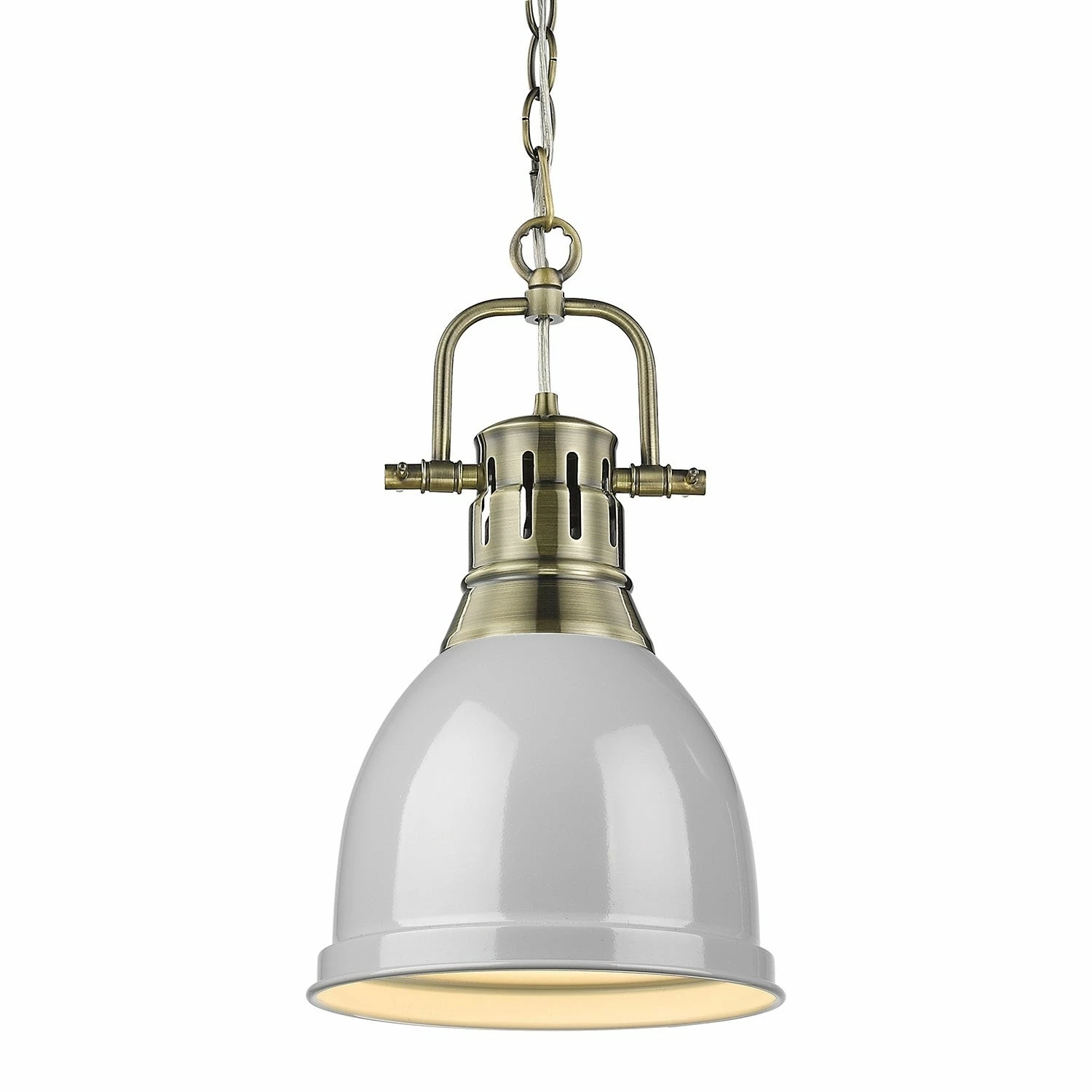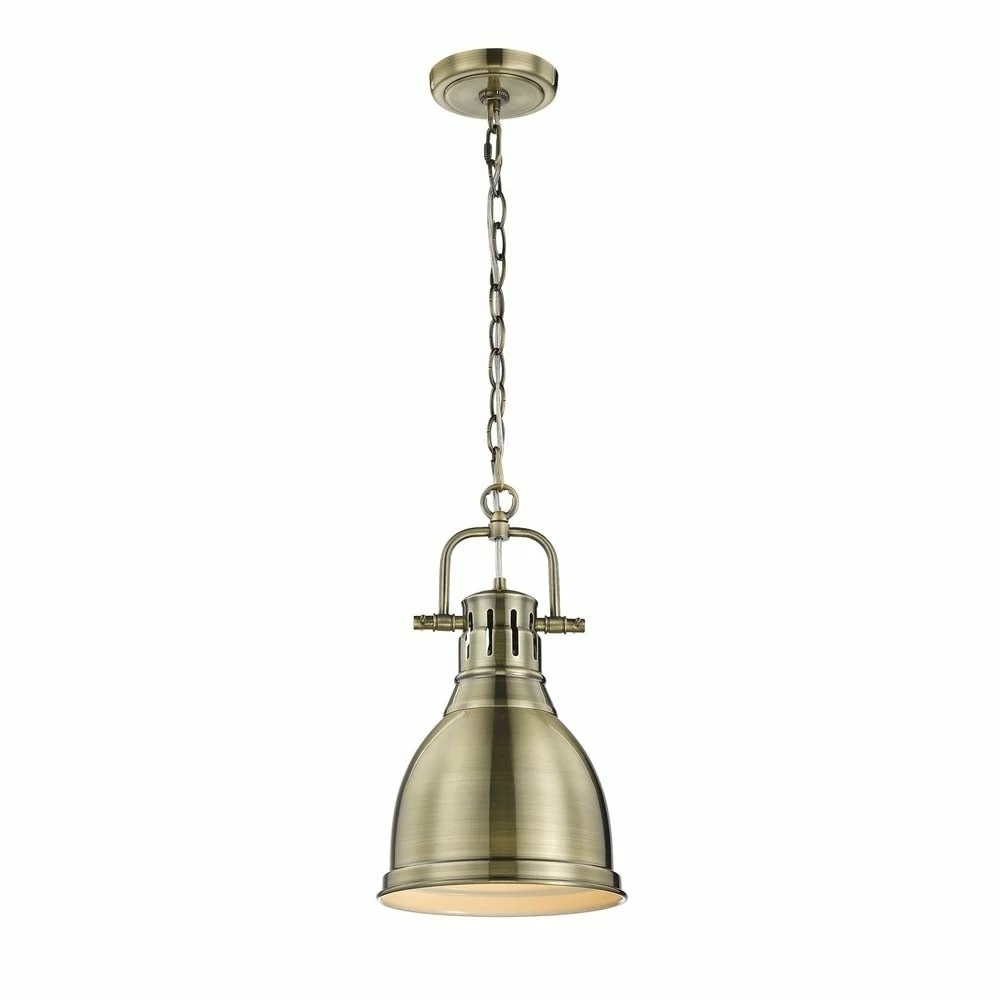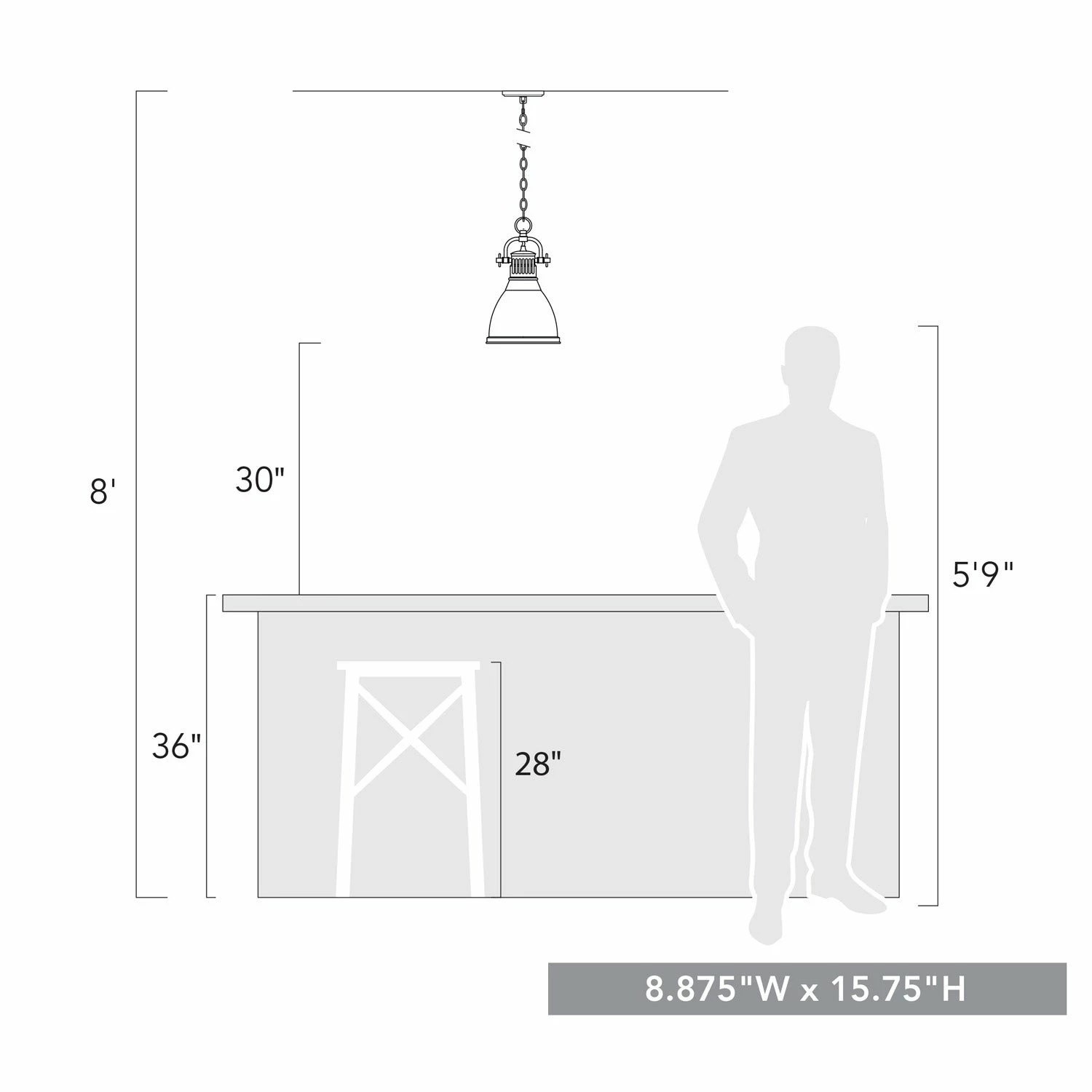 Transform the look of your room with this classic, vintage-inspired fixture by Golden Lighting. Golden Lighting’s Duncan collection is contemporary style with an industrial feel. The collection features a variety of simple, traditional silhouettes that are a nod to a bygone era. A variety of plated and painted metal shade finishes are offered in combination with durable Aged Brass, Chrome or Pewter fixture bodies. Rubbed Bronze fixtures are paired with Rubbed Bronze shades. This small, chain-hung pendant features a may be hung individually or grouped over a bar.
