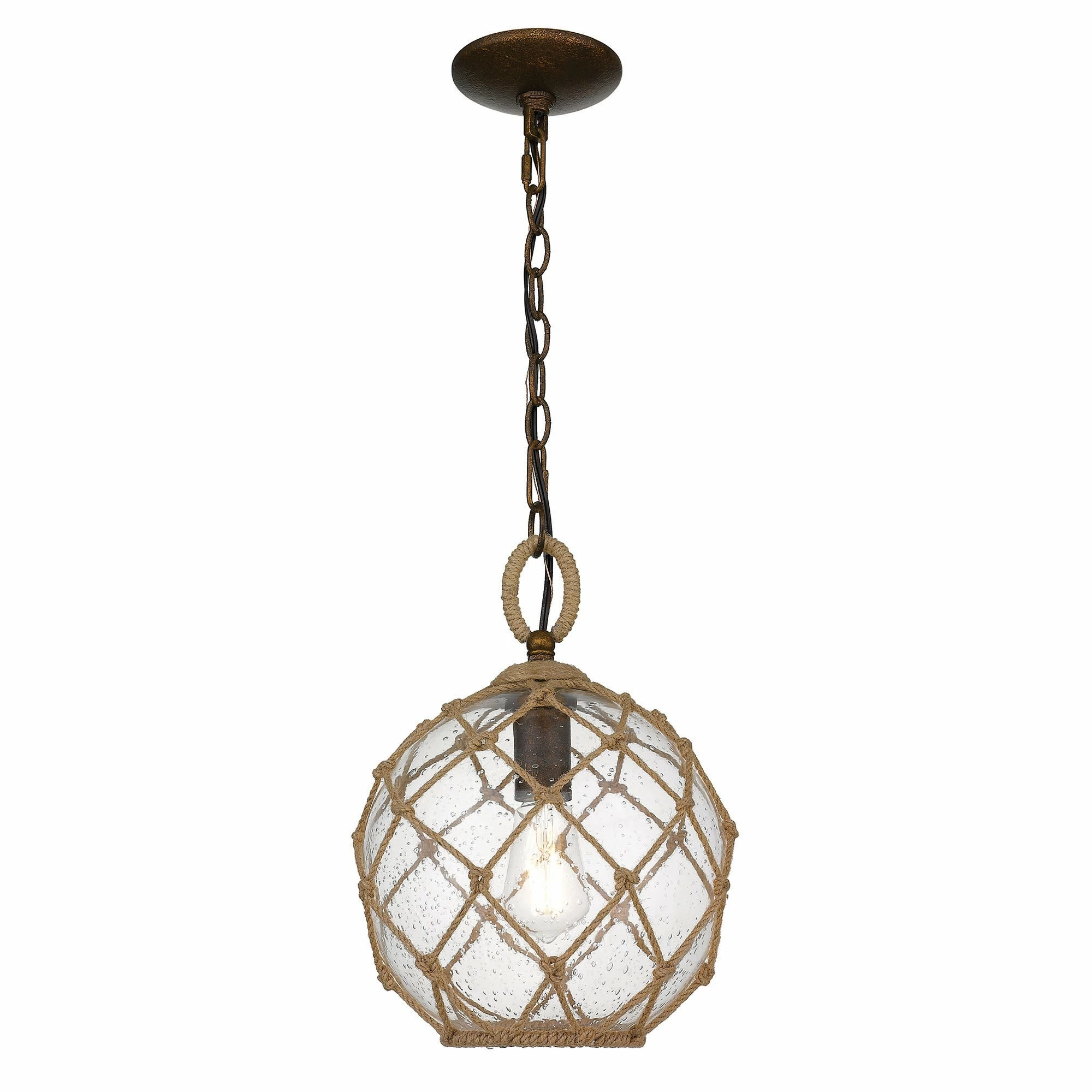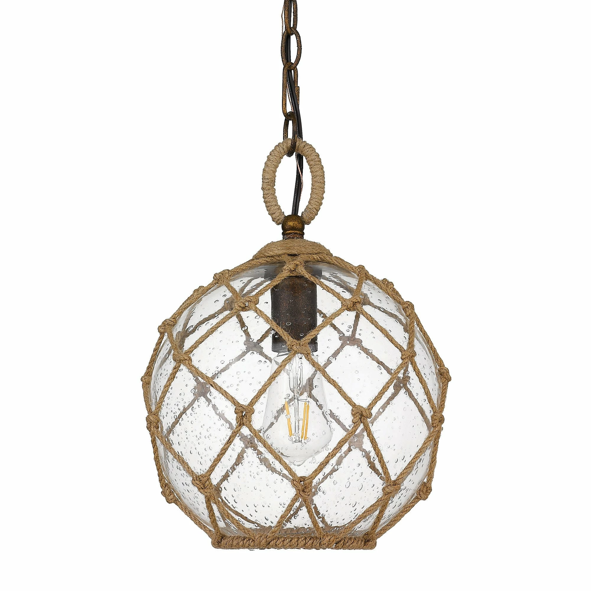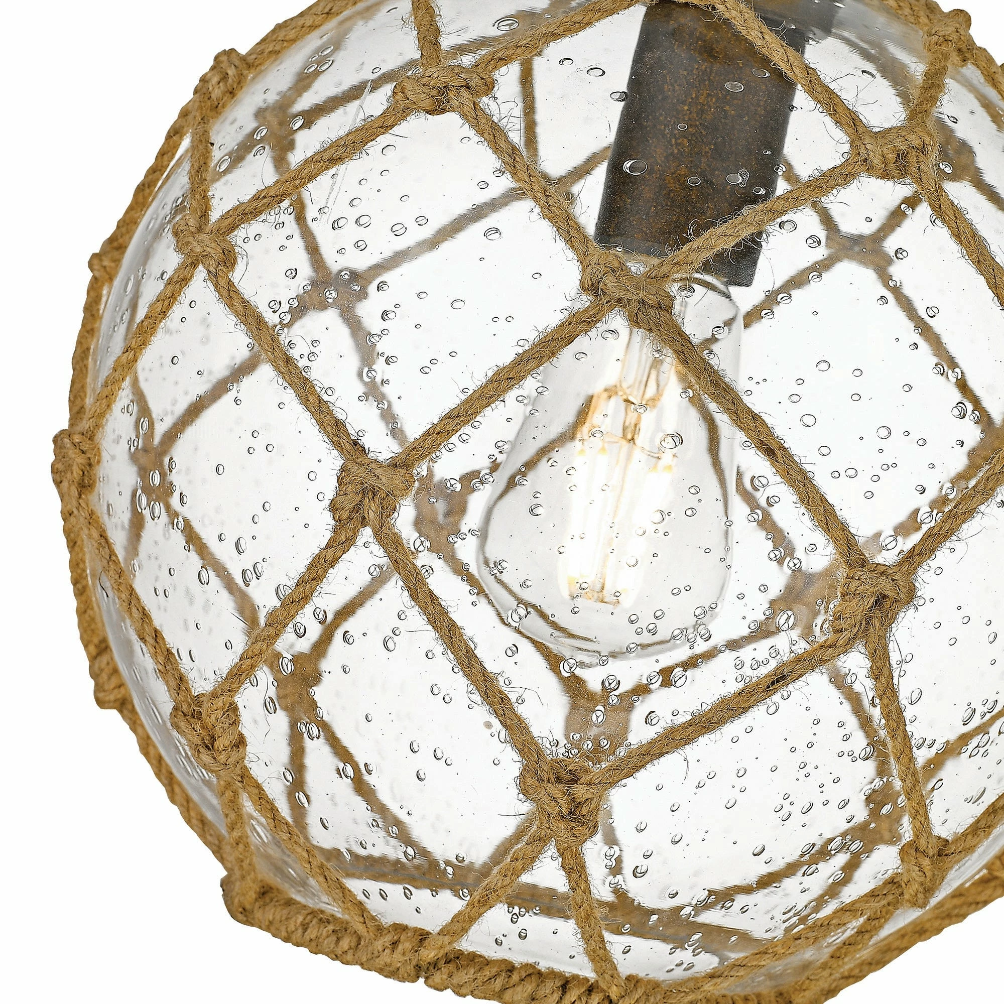 Haddoc has the look of a reclaimed sea treasure, brought home and revamped. The large, round, seeded glass is reminiscent of an iridescent bubble magically snared by a net. Enhancing the nautical-inspired design, knotted rope and contrasting hardware mimic old-world tools. These bright pendants allow for widespread illumination and are perfect in coastal settings.