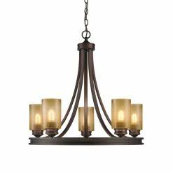 Cast your decor into handsome relief with the generous glow of this five-light chandelier. This chandelier’s single-tier array expedites multidirectional illumination sufficient for a medium or large room, with a steel frame for structural soundness and a bronze finish bespeaking rustic charm.