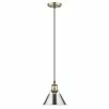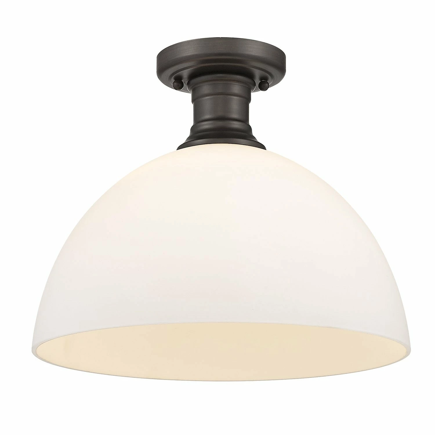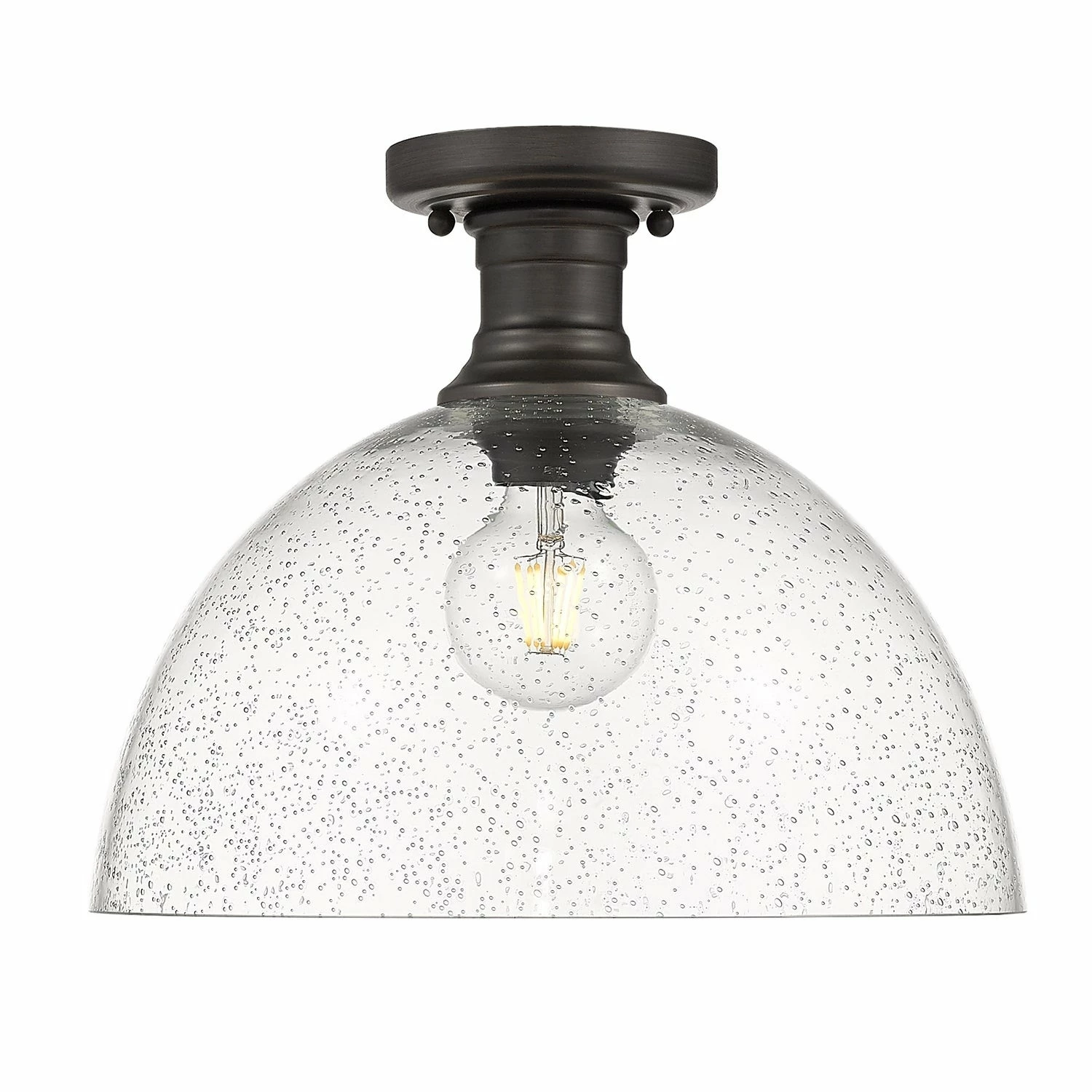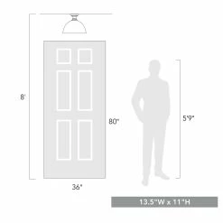 Offered in four smooth finishes, with two glass options, Hines is suitable for a variety of decors. The transitional style is a marriage of traditional silhouettes with modern finishes. The black, rubbed bronze, pewter and chrome fixtures are paired with opal or seeded glass shades. This 14″ semi-flush is approved for damp locations.