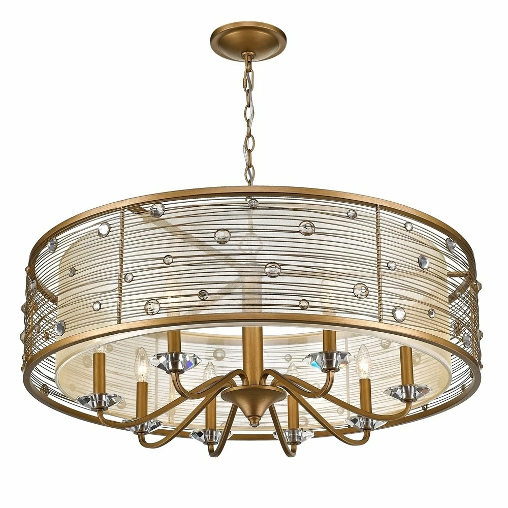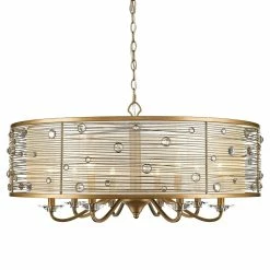Accent your home with the mid-century detailing of this beautiful Joia eight-light chandelier. Glass crystal accents dress up this fixture’s Peruvian-gold-finished filigree shade for a brilliant sparkle when the bulbs are lit, while light antiquing adds an heirloom look to complement your vintage pieces.