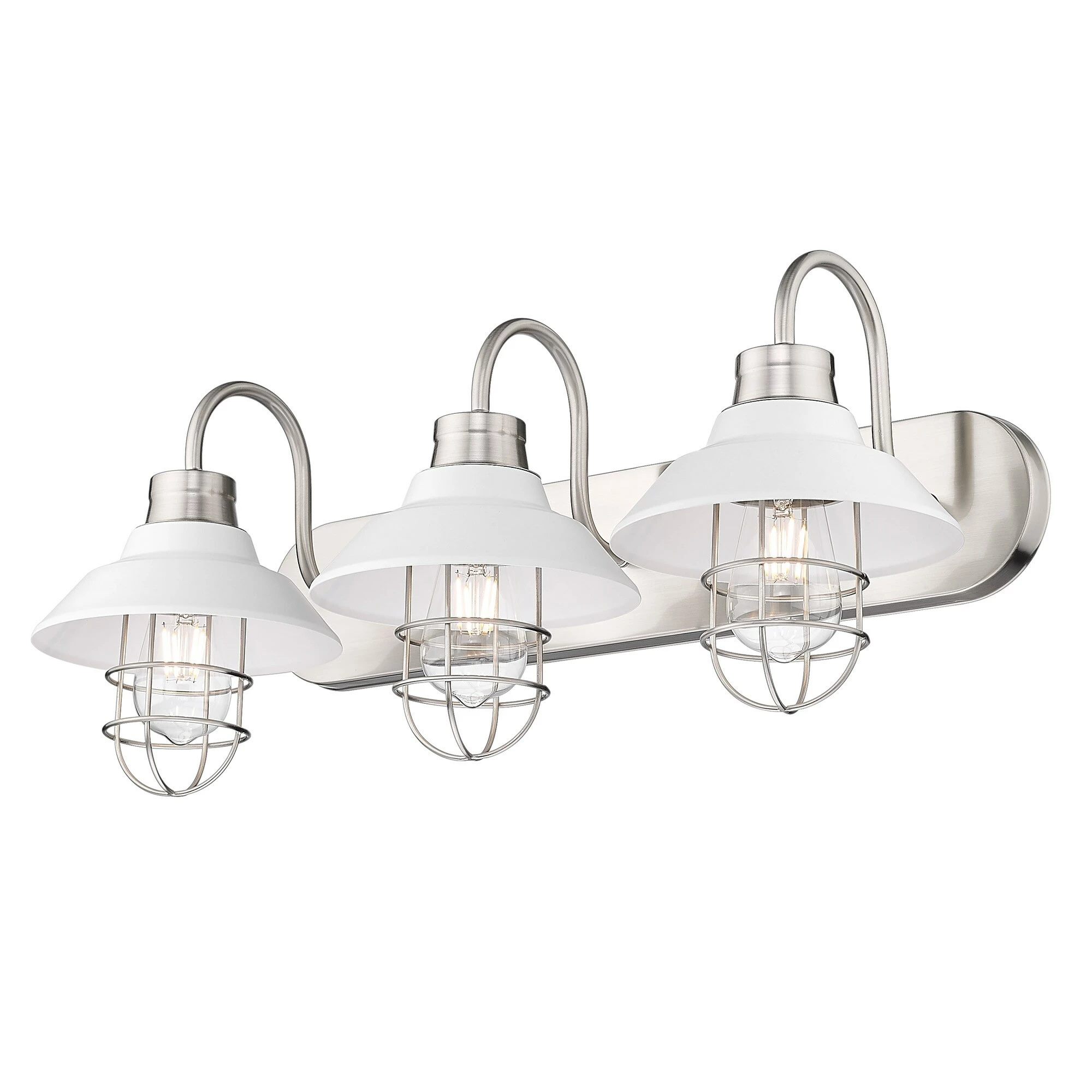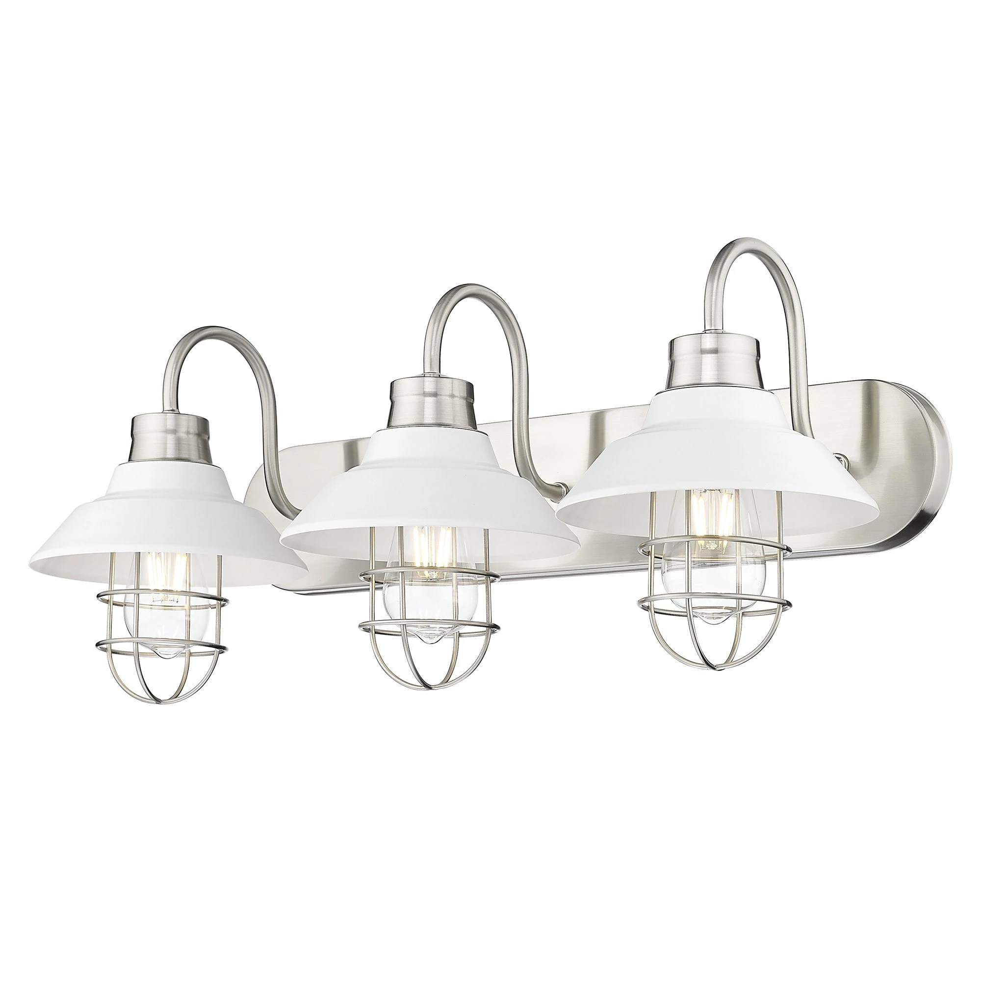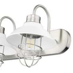 This coastal, industrial, New England-inspired design is suited for transitional spaces. The Lana bath vanity has a modern two-tone color combination. The Pewter finish of the protective metal bulb shields and Gooseneck arms matches the long oval backplates. In sharp contrast, the interior and exterior of the partial metal shades are finished in Matte White. Enhance the look of the fixture by installing specialty bulbs.