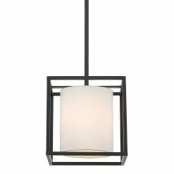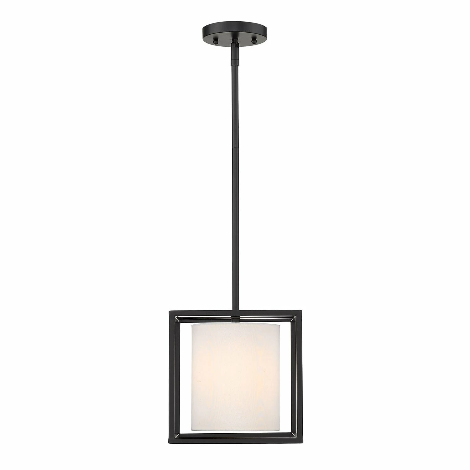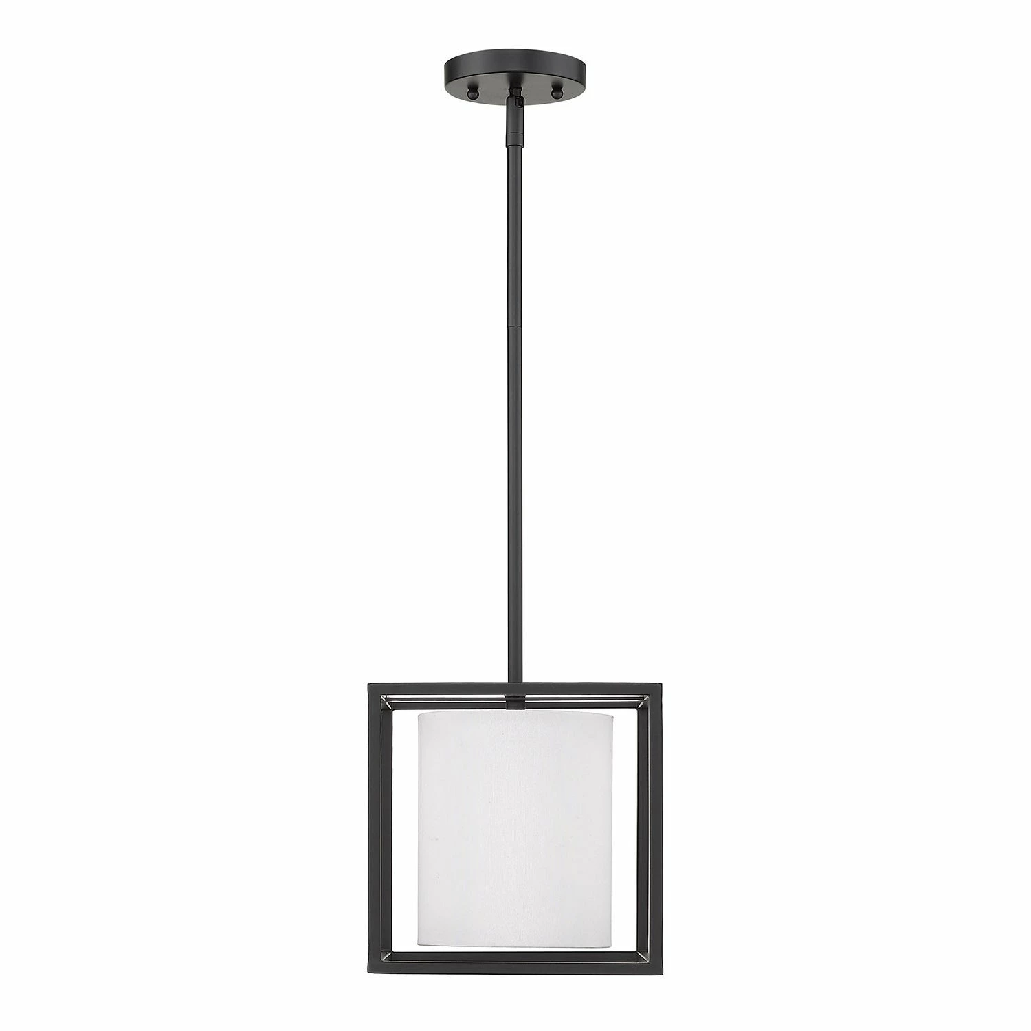 This simple and versatile look is at home in transitional to modern settings. The smooth, matte black finish adds a contemporary feel. The neutral white shade dresses up the look, while softening the geometric lines and gently diffusing the light. Easily customize the height of the fixture to suit your installation needs. This mini pendant is perfect grouped over an island or bar.