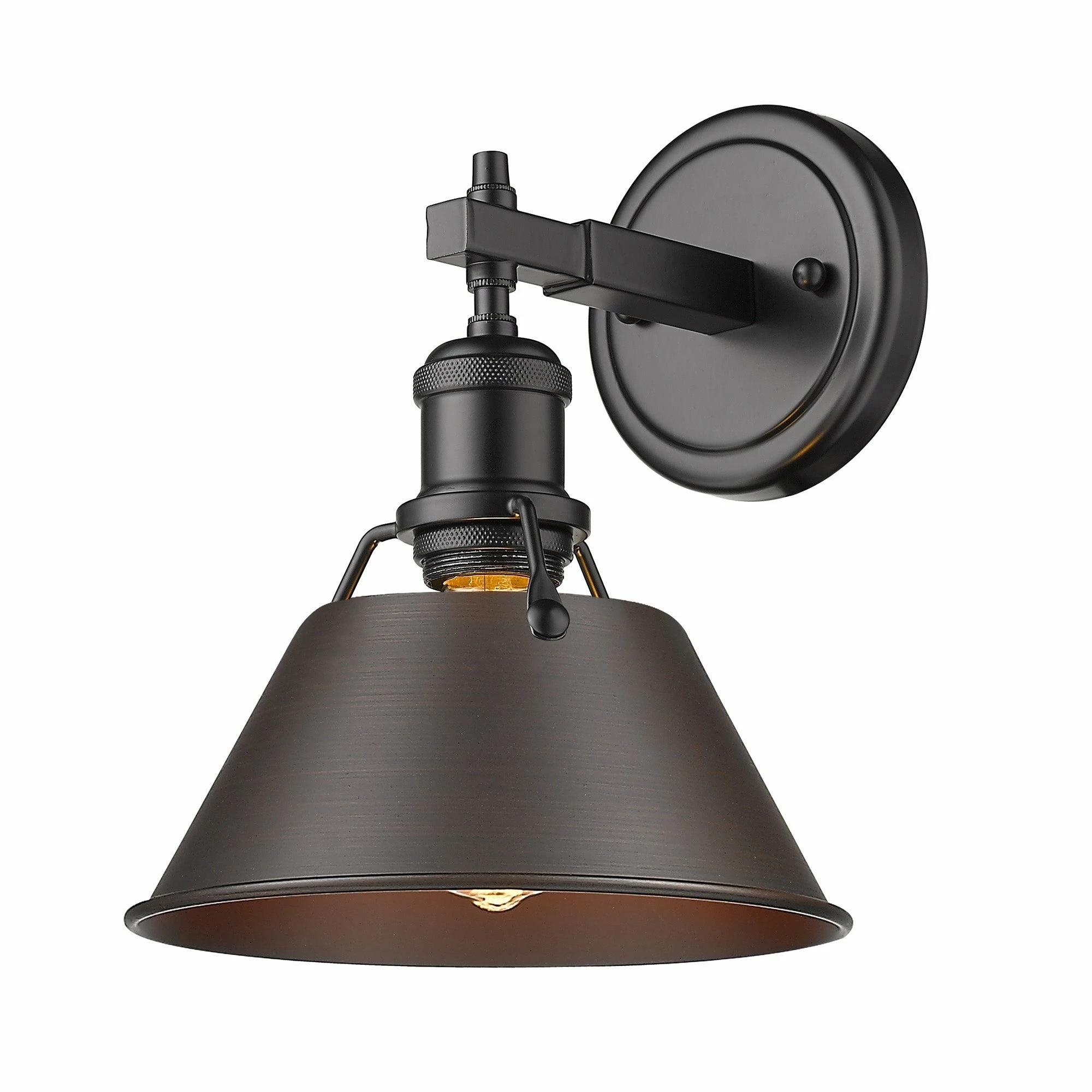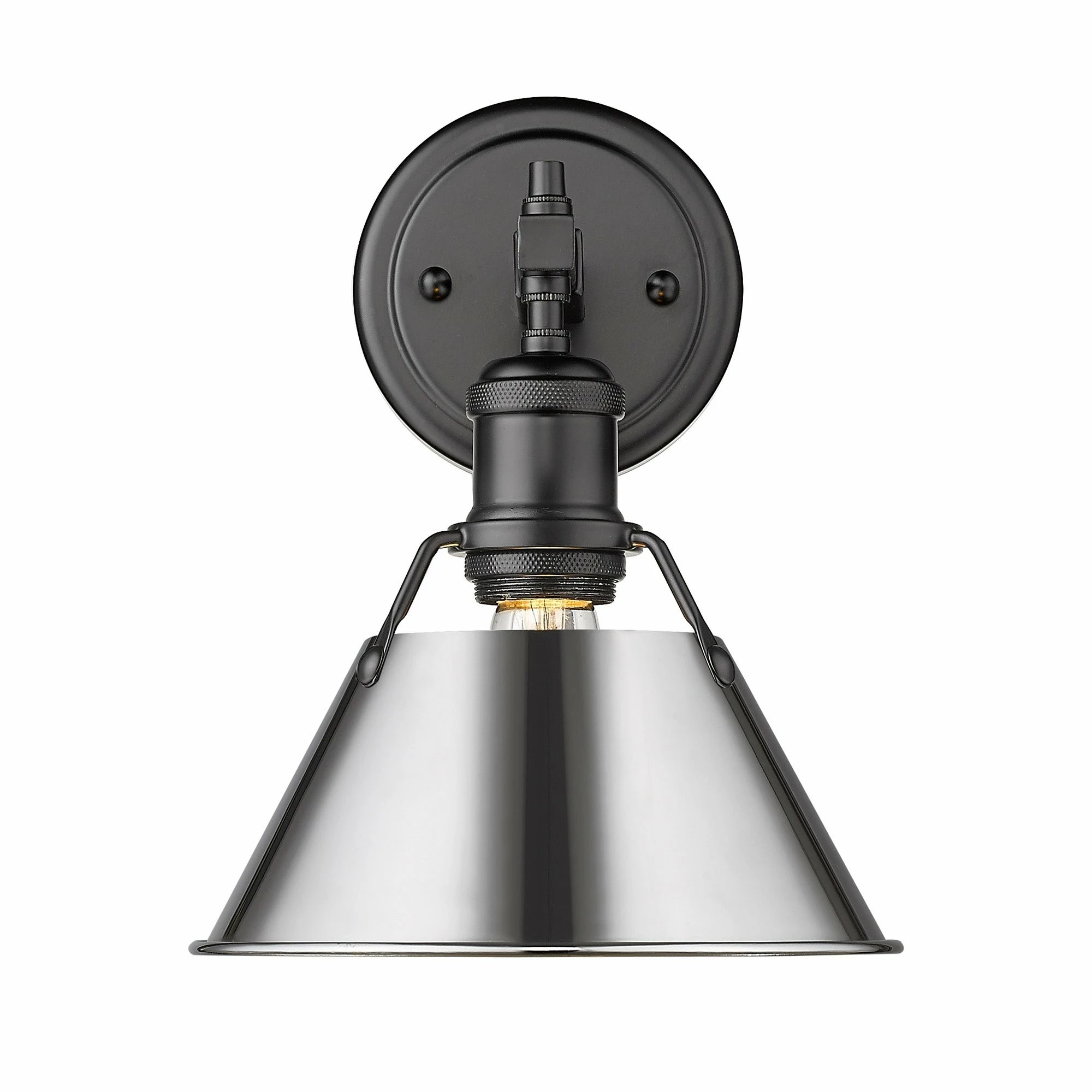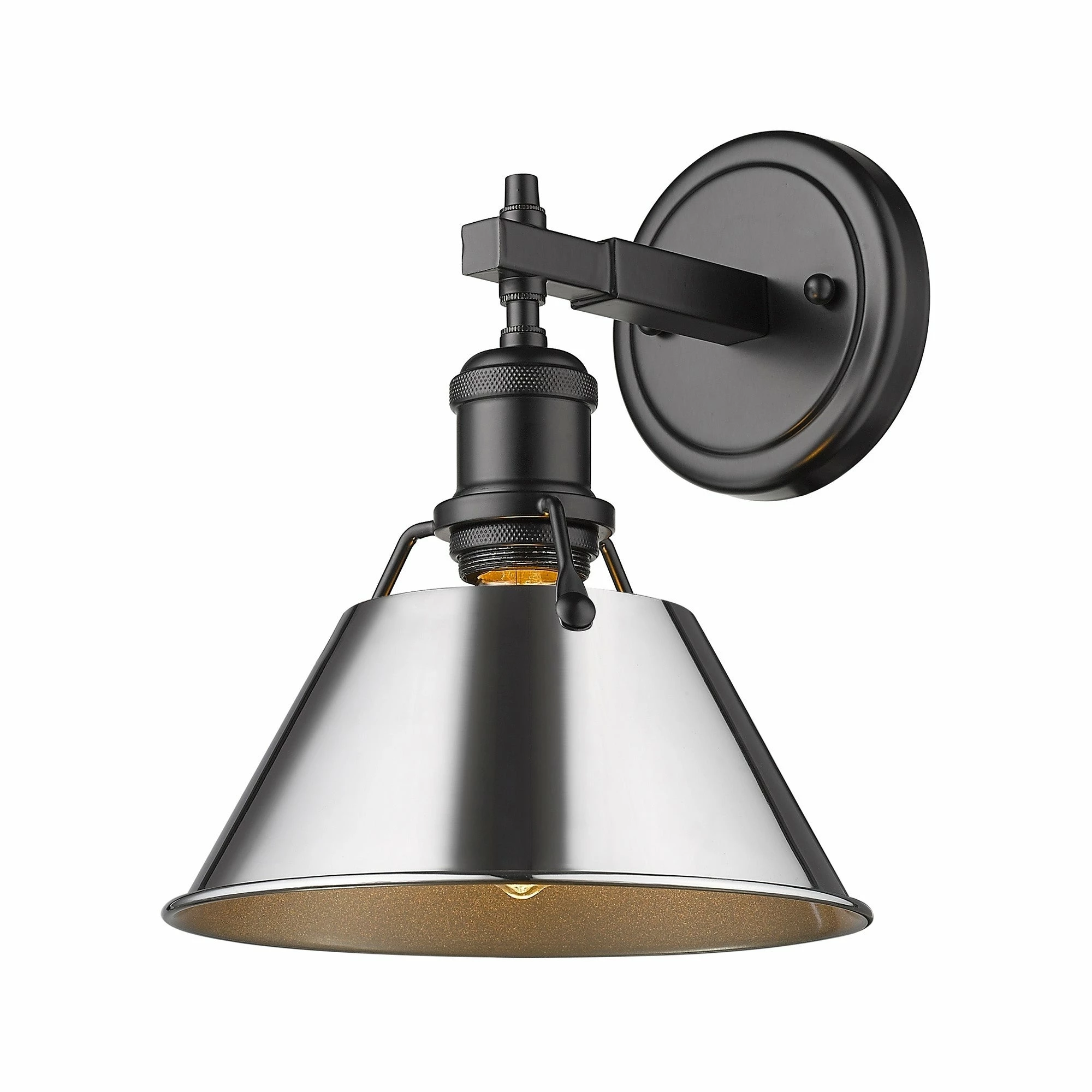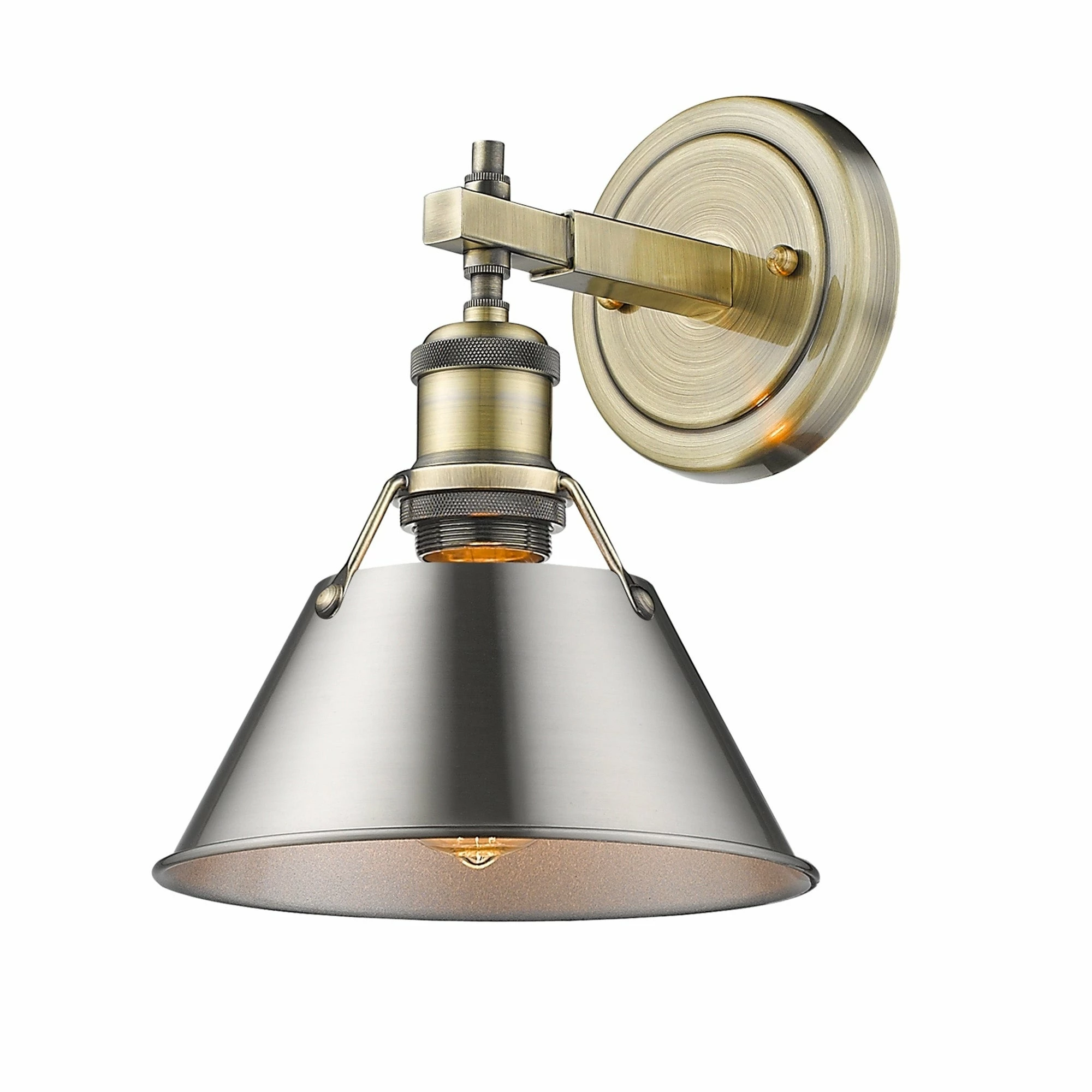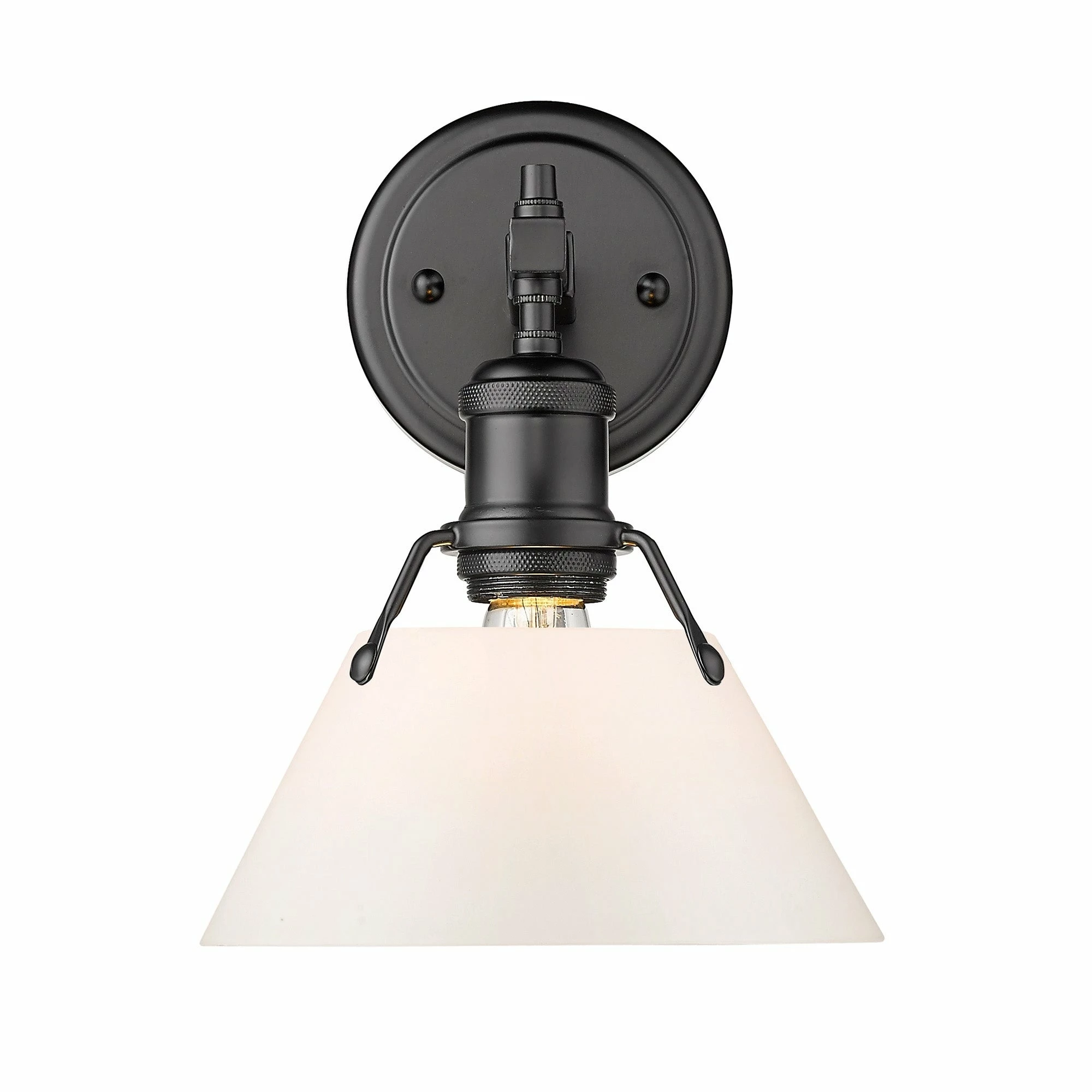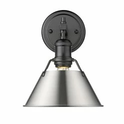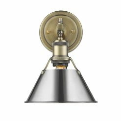 Finish a transitional bathroom setting with this single light Orwell vanity fixture. Combining the vintage look of aged brass with the neutral black shade, this Golden Lighting design provides a gorgeous high-contrast look.