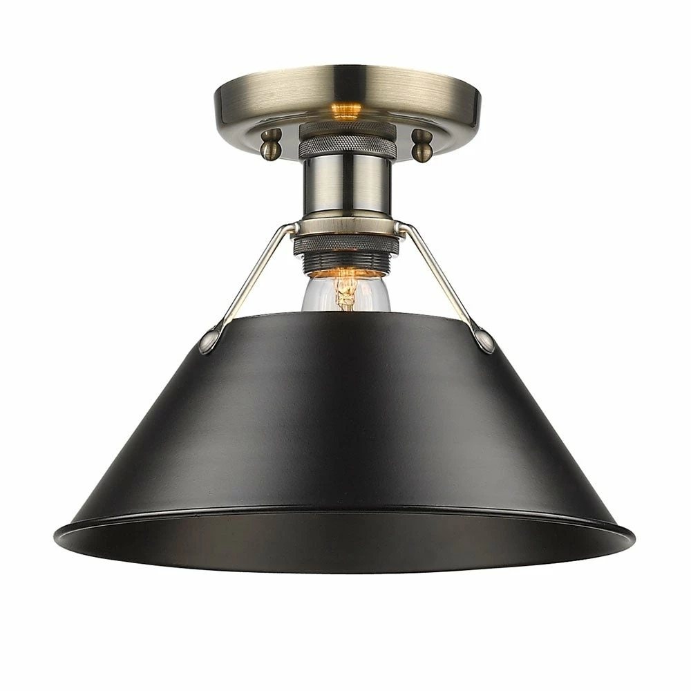 Ugrade your lighting with this aged brass light fixture complemented by a rich black shade. This fixture mounts flush to the ceiling for a clean, minimalist look perfect for classic and modern homes alike.