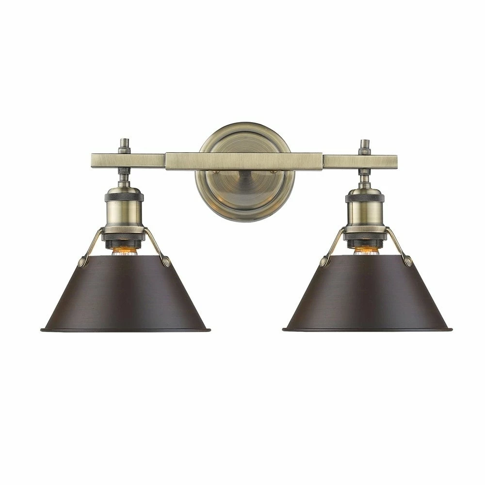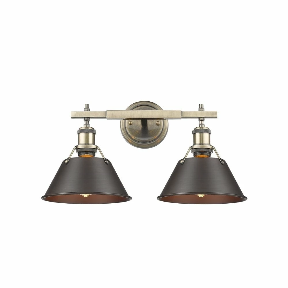Upgrade your vanity lighting with this two-light fixture with aged metal finishes. The tops of the shades on this fixture are open to expose part of the bulb for a distinctive look.