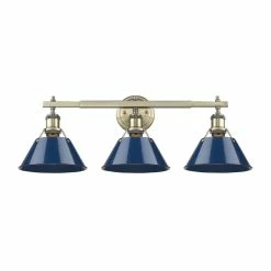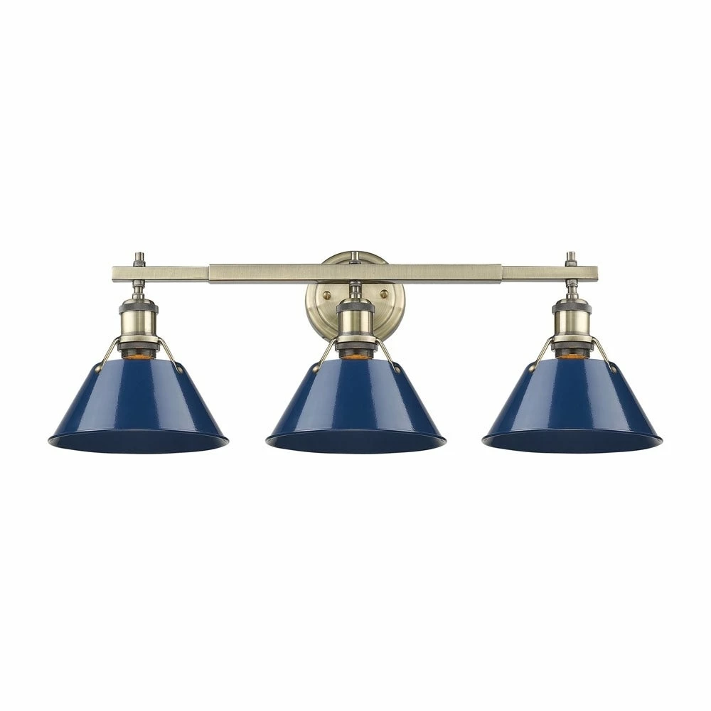 Bring classic style to your bathroom by installing this Golden Lighting Orwell vanity light fixture with an aged brass finish and navy blue shades. Constructed of steel for durability, this vanity light has a vintage-inspired industrial look.