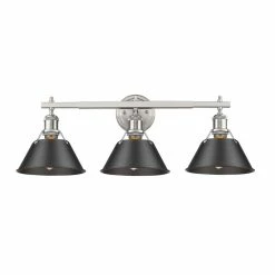 Light your bathroom vanity while adding elegance to your decor with this three-light pewter fixture. This wall-mount light fixture features black shades and a brushed finish to enhance your decor.