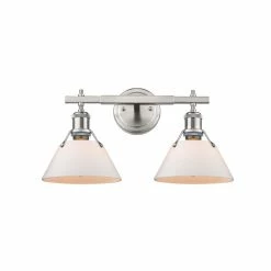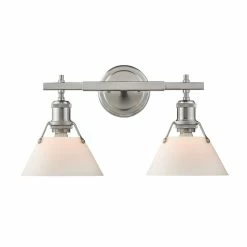 Create a sleek, modern bathroom by installing this pewter bath vanity with opal glass shades. This two-light vanity has spaces above the shades to help disperse heat and provide a safe lighting source.