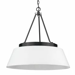 Penn’s distinctive wide brim and conical shape draw focus in a subtle, understated manner. The designers used classic pairings to create a fashionable, timeless look. A dramatic, matte black collar looks great when placed atop the Modern White Shade. Clean and flawlessly elegant, the series is perfect for contemporary spaces. When on, the downlights create a warm glow within the encased shades. This generously-sized 6-light pendant chandelier creates a bright pool of light over a dining table.