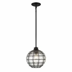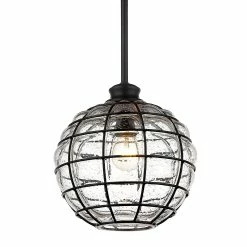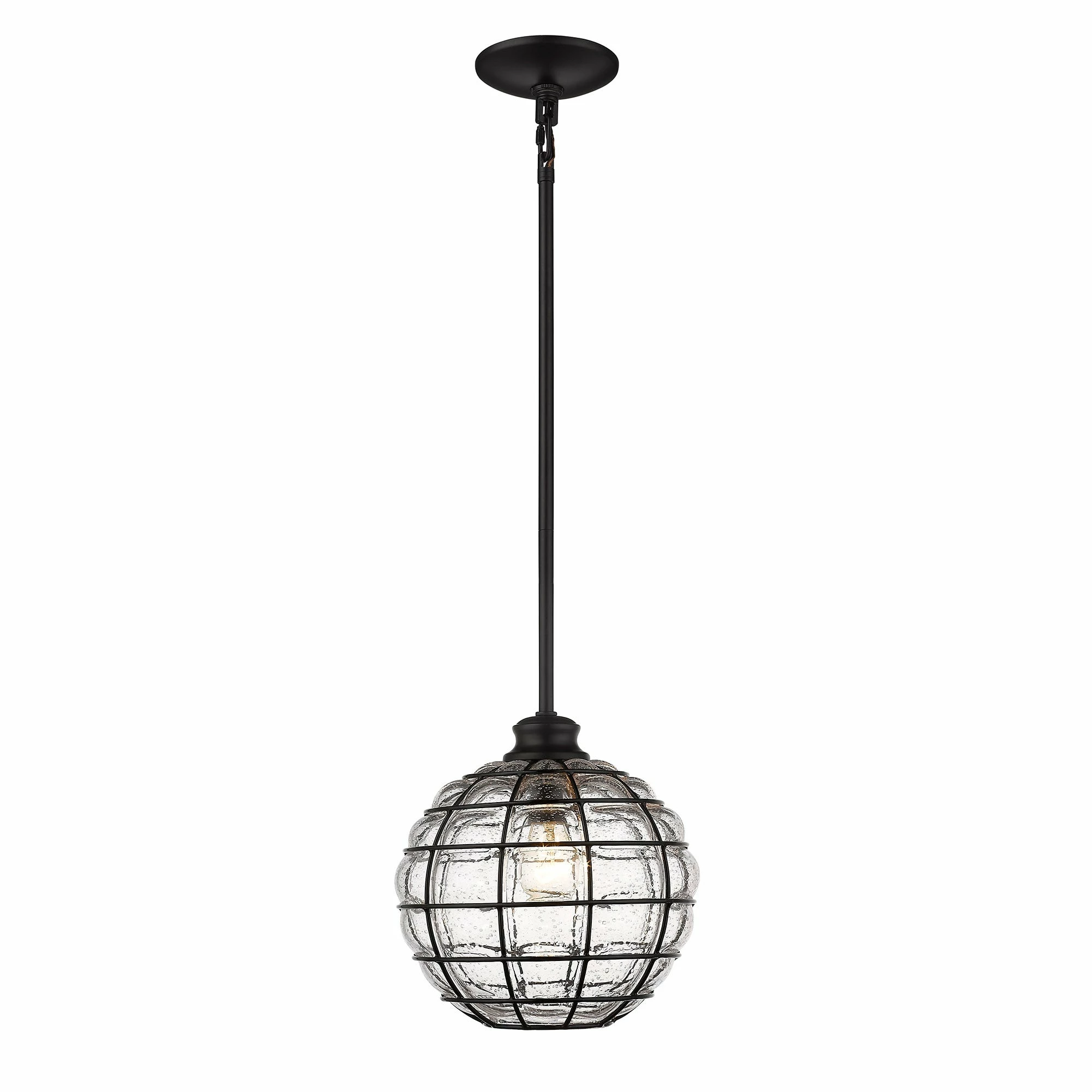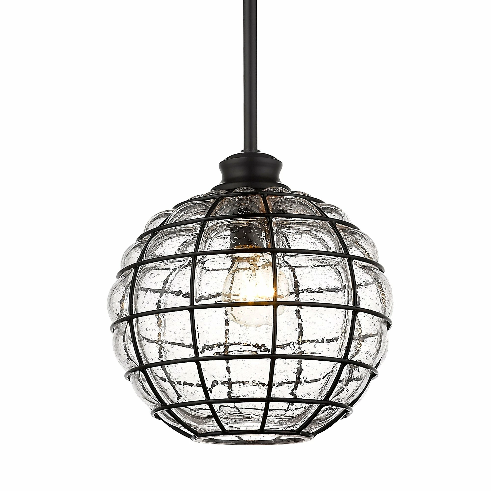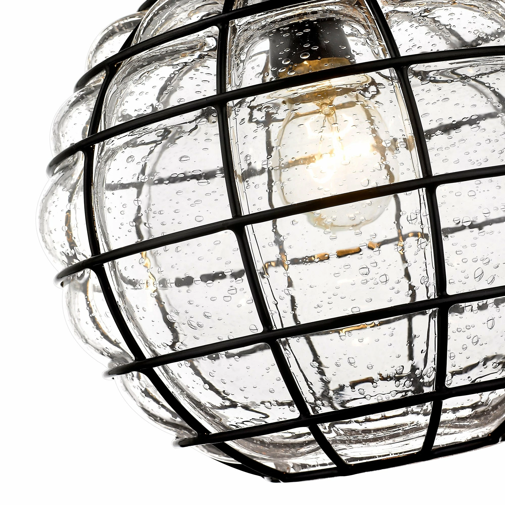 Powell is a collection of lovely glass and metal pendants. The decorative, mixed materials of the shades are the focus of these contemporary fixtures. To allow the shades to take center stage, the remaining Matte Black hardware is kept simple by design. Composed of curved iron, the shade’s metal ribbing forms an elongated sphere. Open at the bottom and handblown by artisans, the structured glass has an industrial-modern feel. During the blowing process, hot, molten glass pours through each crevice creating raised bubbles along the surface. As it cools, the seeded glass clings to the grid-like metal cage. When lit, the gently diffused shades have a unique glow. Beckoning onlookers, these lights add visual interest anywhere they hang.