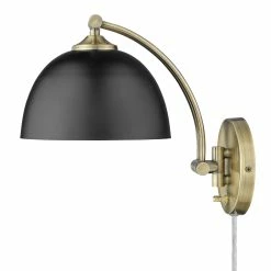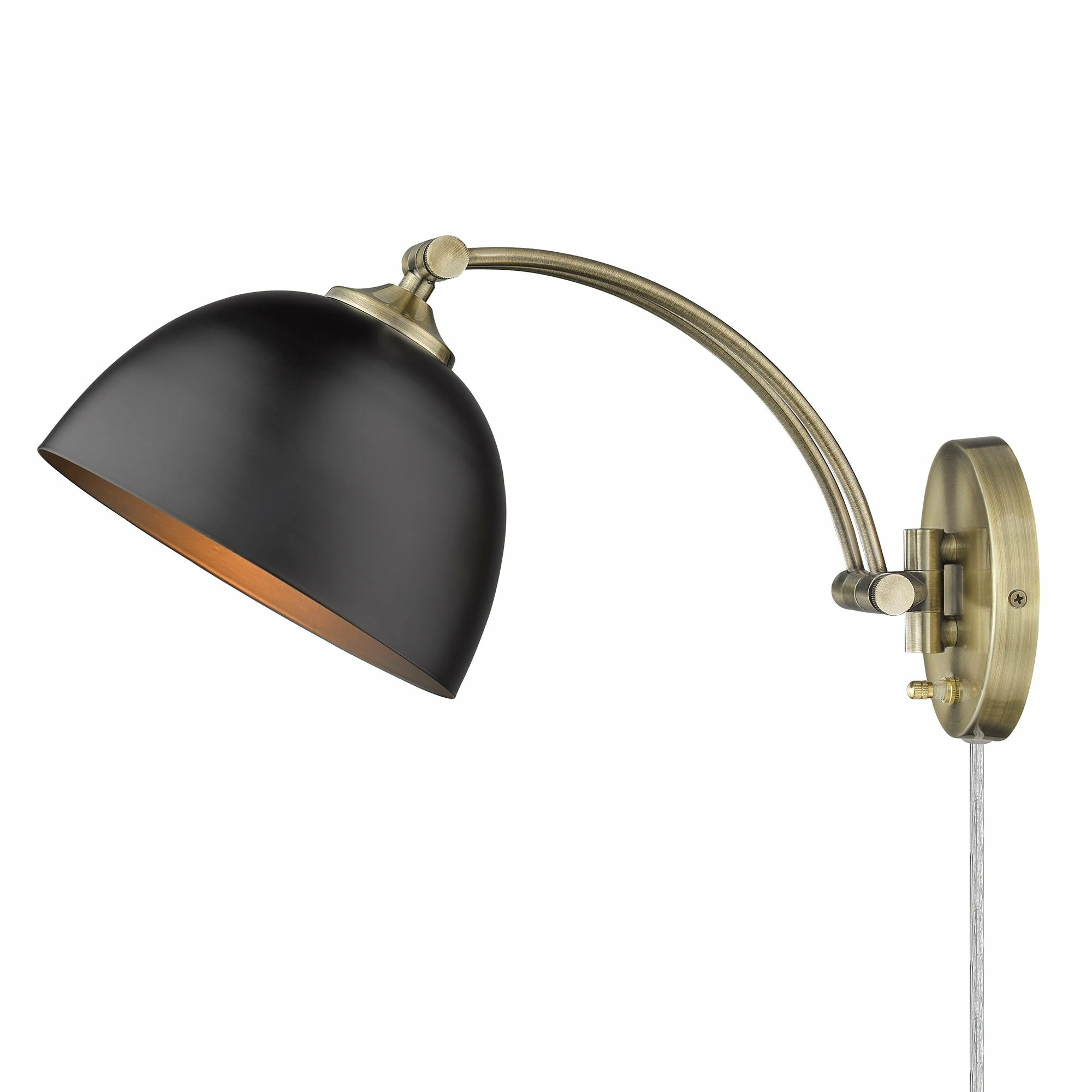 Functional design inspired by modern style, Rey is a prime choice for refined illumination. Pivoting, parallel arms sweep and connect two industrial-inspired lock pins. A wide shade drops elegantly from the arm. Great for task lighting, the moving arm and adjustable shade can be positioned and locked in place for style and function. The versatile series offers two installation options: Plug-in or Hardwire. The collection is available in a choice-selection of finish and shade color combinations. The shade interior is painted an Aged Brass finish.