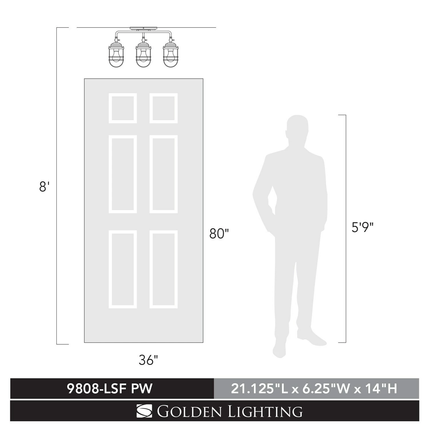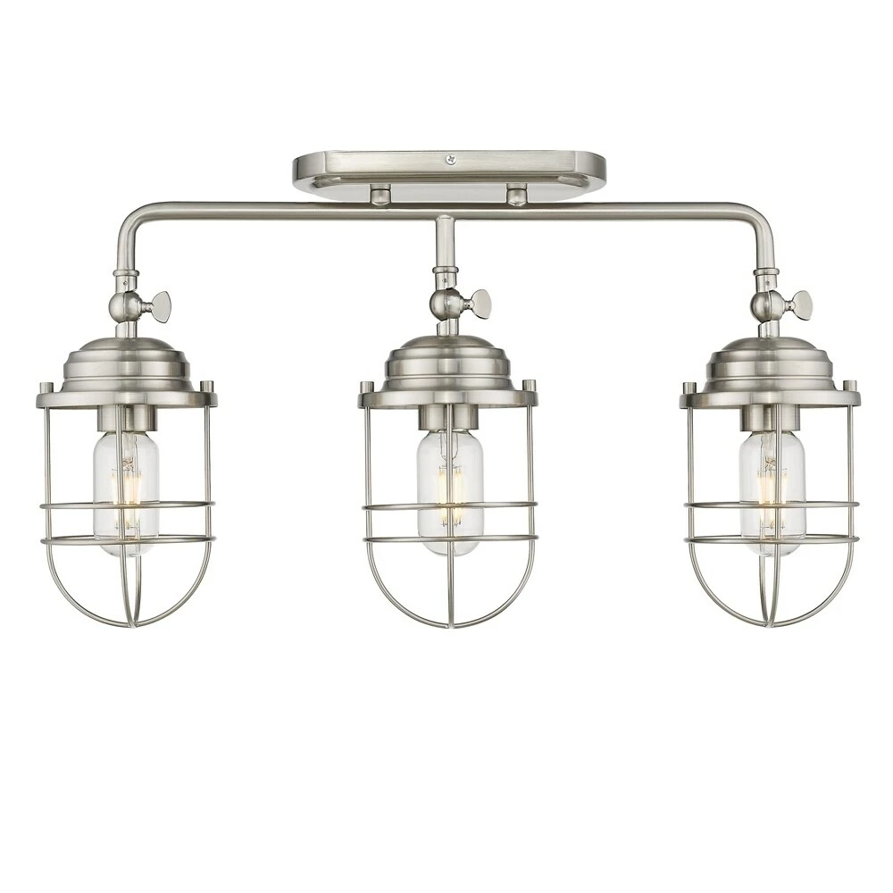 Nautical-inspired, Seaport is a collection of industrial fixtures to create your seaside retreat. Offered in pewter and matte black, the New England style is enhanced by protective cages that shield the otherwise exposed bulbs. Created to suit the needs of many, swivel canopies allow the fixtures to be mounted on sloped ceilings. Ball joints permit a multitude of configurations. Point all of the metal shades down for directional task lighting or angle them out to fit a low ceiling or tight space. This 3-light linear semi-flush is damp rated and may be mounted on the wall or ceiling.