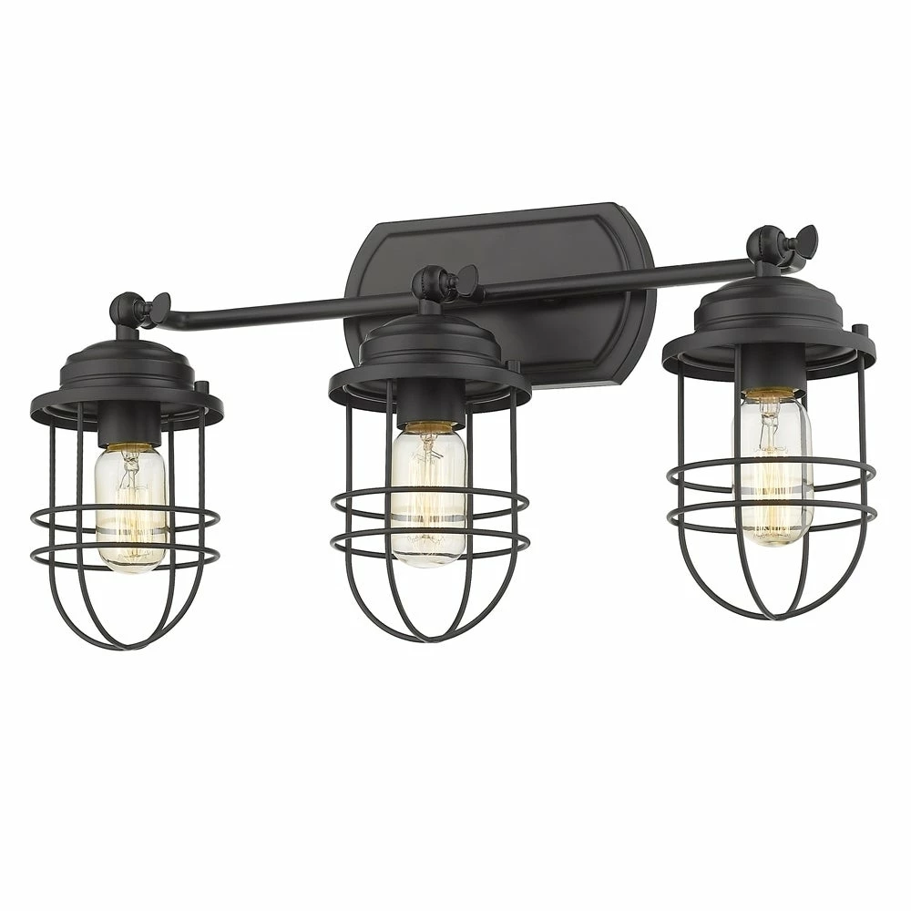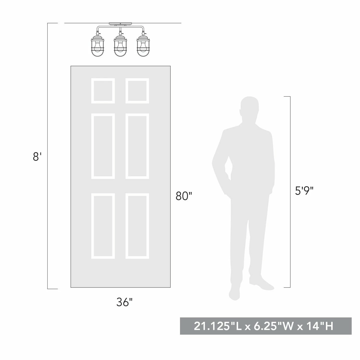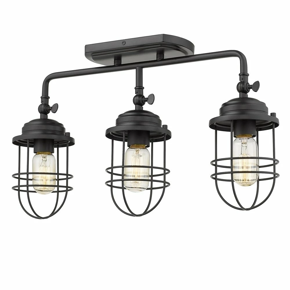 Nautical-inspired, Seaport is a collection of industrial fixtures to create your seaside retreat. Offered in pewter and matte black, the New England style is enhanced by protective cages that shield the otherwise exposed bulbs. Created to suit the needs of many, swivel canopies allow the fixtures to be mounted on sloped ceilings. Ball joints permit a multitude of configurations. Point all of the metal shades down for directional task lighting or angle them out to fit a low ceiling or tight space. This 3-light linear semi-flush is damp rated and may be mounted on the wall or ceiling.