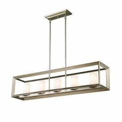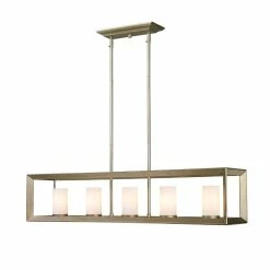 Modern lanterns featuring a handsome beveled cage design make a modern, elegant statement in the Smyth collection. Clean geometry creates contemporary style with steel candles and candelabra bulbs encased in two glass options. The fixtures are offered in 3 finishes: Chrome, Gunmetal Bronze and White Gold. The gleaming Chrome finish adds a sleek, contemporary option to this open-caged collection. A darker option, the Gunmetal Bronze finish has warm bronze undertones and is perfect for all industrial or vintage aesthetics. The White Gold finish option softens the geometric form, creating a more delicate and transitional appearance. Glass fixtures are available with Clear Glass or Opal Glass shades. This 5 light linear pendant illuminates a kitchen bar, dining table, or similar area without interfering with activity at the surface.