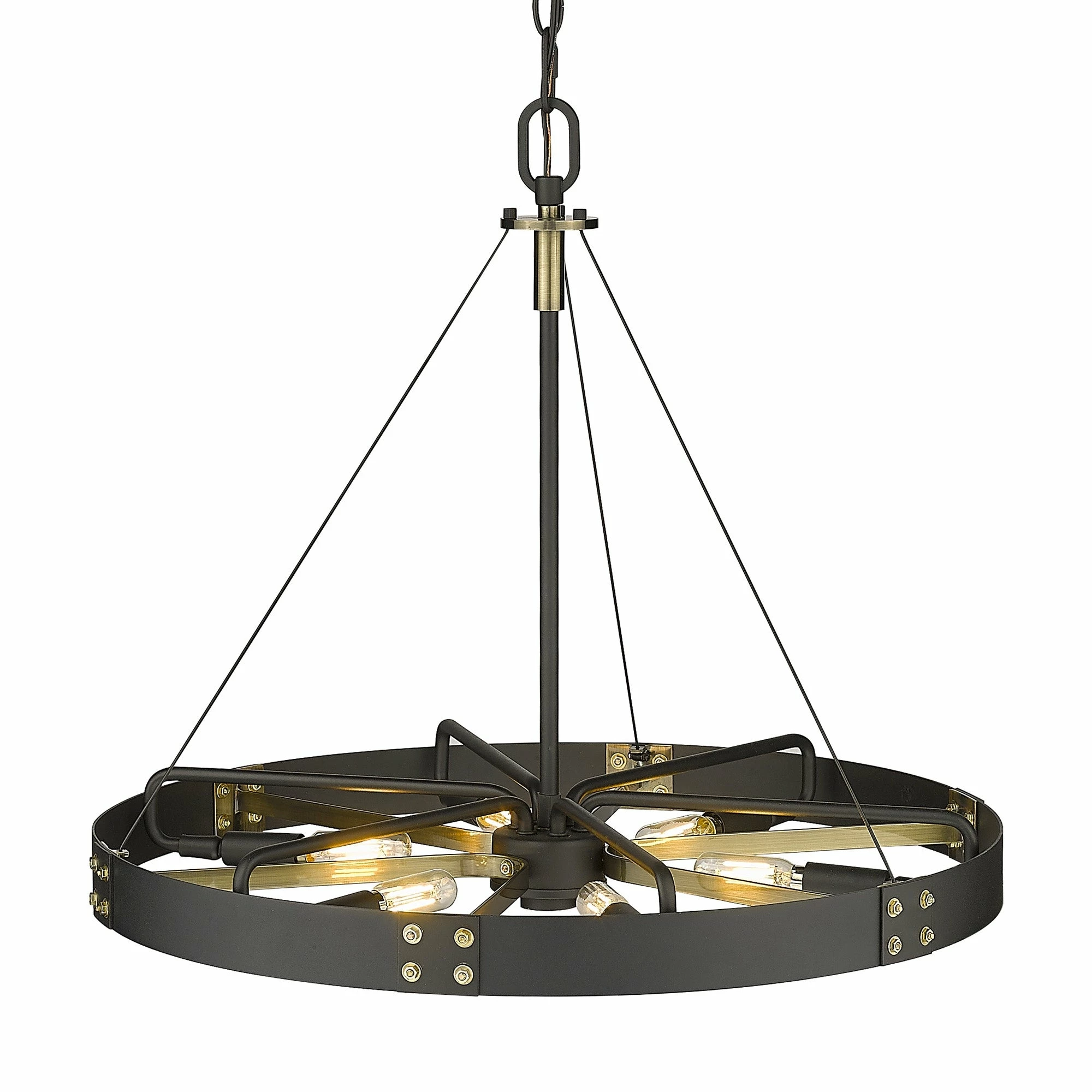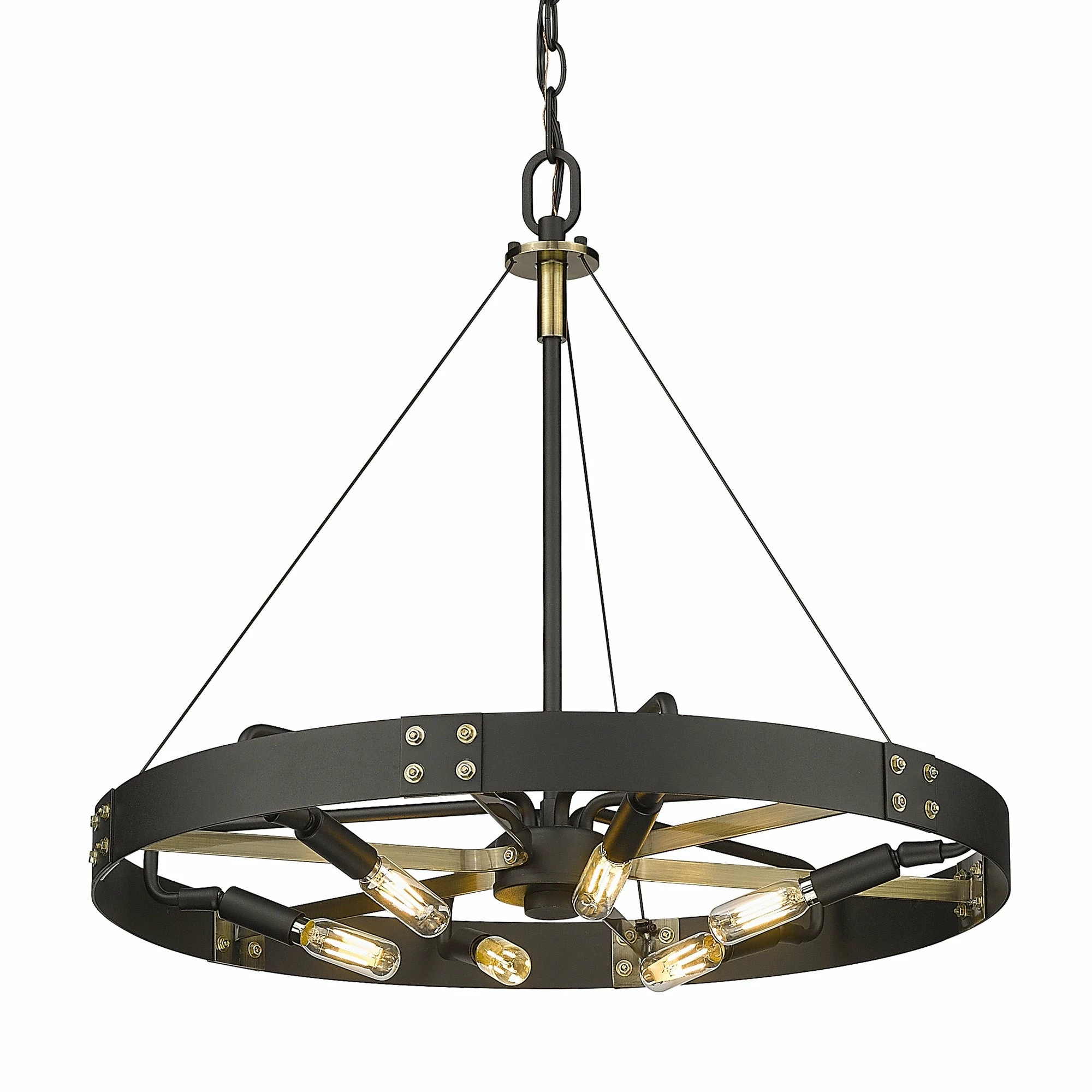 Industrial by nature, Vaughn fits well in contemporary homes. Inspired by the spokes of a vintage wagon wheel, this collection brings antiquity to the modern age. The Natural Black finish is slightly textured and adds drama to this focal series. Select a monochromaticย version or elevate the look by selecting a fixture with contrasting aged brass accents. Pivoting sockets and steel cables act as additional features to the bold design.