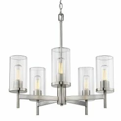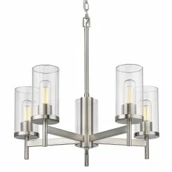 Golden Lighting’s Winslett collection is versatile and transitional in style. Classic silhouettes are perfectly matched with clean, modern lines for a mixture of form and function. Bright bulbs shine within ribbed clear glass shades. The linear texture, made by a glass-blowing technique, creates the optical illusion of distortion. The vertical lines in the glass provide gentle diffusion while playfully refracting light. Offered in two highly adaptable finishes; Pewter and Matte Black, the Winslett collection is suitable for a variety of decors. This 5-light chandelier creates a stylish focal point and is comfortably sized for intimate dining and living areas.