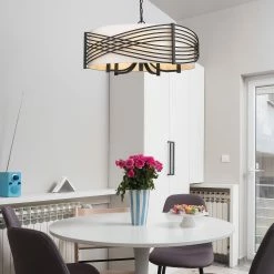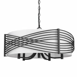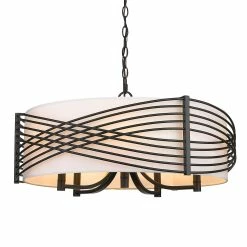Zara is a fashionable, transitional style. Thin bands of steel in select finishes flow boldly around a fabric shade in a unique, cross-woven design. The bold rectangular arms are echoed by the rectangular supports of the overlapping metal. This strong geometry is softened by a number of shade options. This 5 light chandelier is perfect for kitchens, living rooms, dining rooms, and foyers.